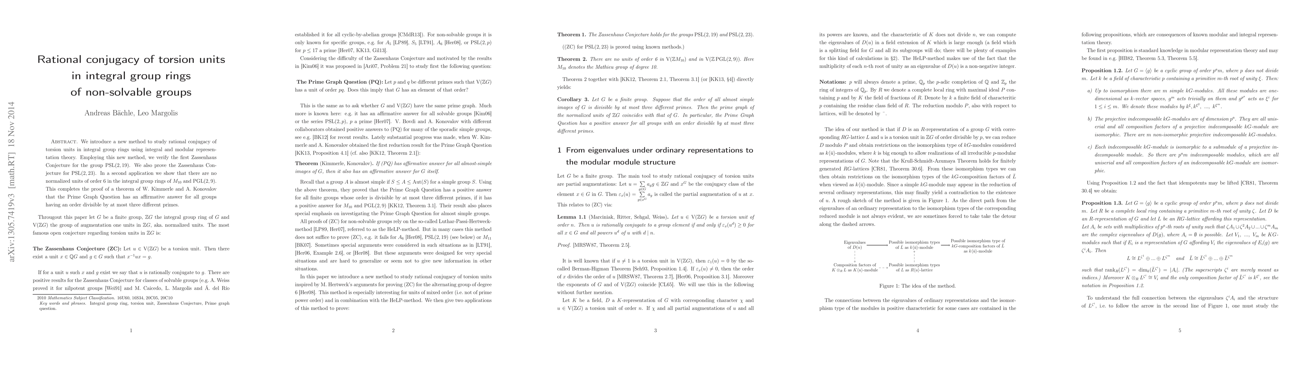 We introduce a new method to study rational conjugacy of torsion units in integral group rings using integral and modular representation theory. Employing this new method, we verify the first Zassenhaus Conjecture for the group $\operatorname{PSL}(2,19)$. We also prove the Zassenhaus Conjecture for $\operatorname{PSL}(2,23)$. In a second application we show that there are no normalized units of order $6$ in the integral group rings of $M_{10}$ and $\operatorname{PGL}(2,9)$. This completes the proof of a theorem of W. Kimmerle and A. Konovalov that the Prime Graph Question has an affirmative answer for all groups having an order divisible by at most three different primes.
