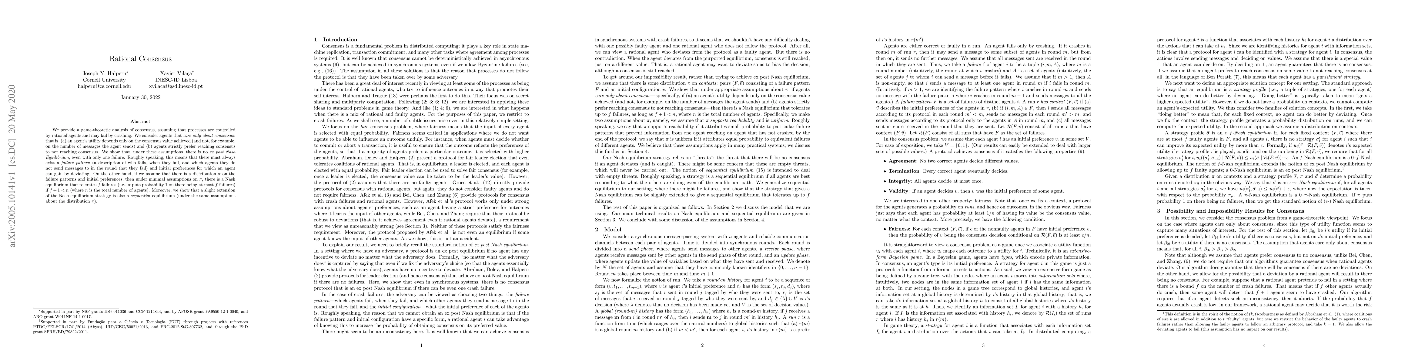Researchers analyzed consensus in a game-theoretic framework, finding that rational agents who prioritize consensus over message sending can never achieve a stable Nash Equilibrium with no failures, but can stabilize with minimal assumptions about initial preferences and failure distributions.