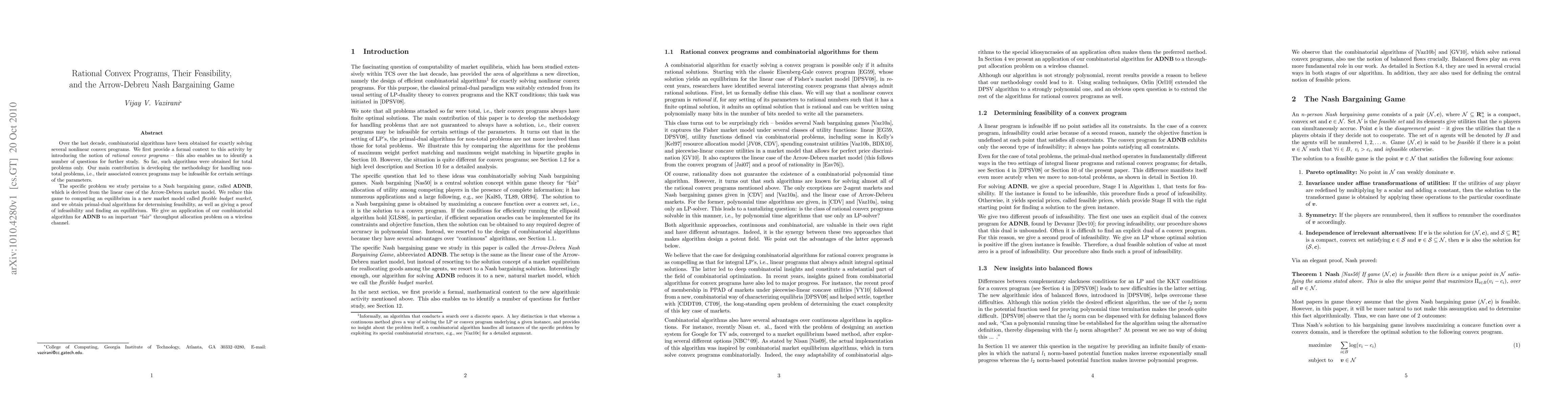 This paper introduces rational convex programs and develops algorithms to solve them, especially for non-total problems where infeasibility may occur. It applies this methodology to a Nash bargaining game derived from the Arrow-Debreu market model, providing primal-dual algorithms for determining feasibility and finding equilibria, and demonstrates its use in fair throughput allocation on wireless channels.