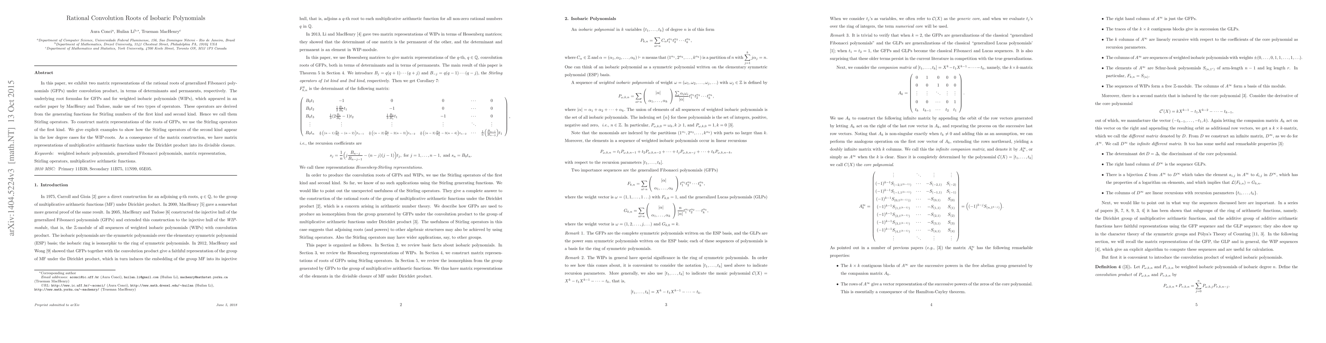 In this paper, we exhibit two matrix representations of the rational roots of generalized Fibonacci polynomials (GFPs) under convolution product, in terms of determinants and permanents, respectively. The underlying root formulas for GFPs and for weighted isobaric polynomials (WIPs), which appeared in an earlier paper by MacHenry and Tudose, make use of two types of operators. These operators are derived from the generating functions for Stirling numbers of the first kind and second kind. Hence we call them Stirling operators. To construct matrix representations of the roots of GFPs, we use the Stirling operators of the first kind. We give explicit examples to show how the Stirling operators of the second kind appear in the low degree cases for the WIP-roots. As a consequence of the matrix construction, we have matrix representations of multiplicative arithmetic functions under the Dirichlet product into its divisible closure.