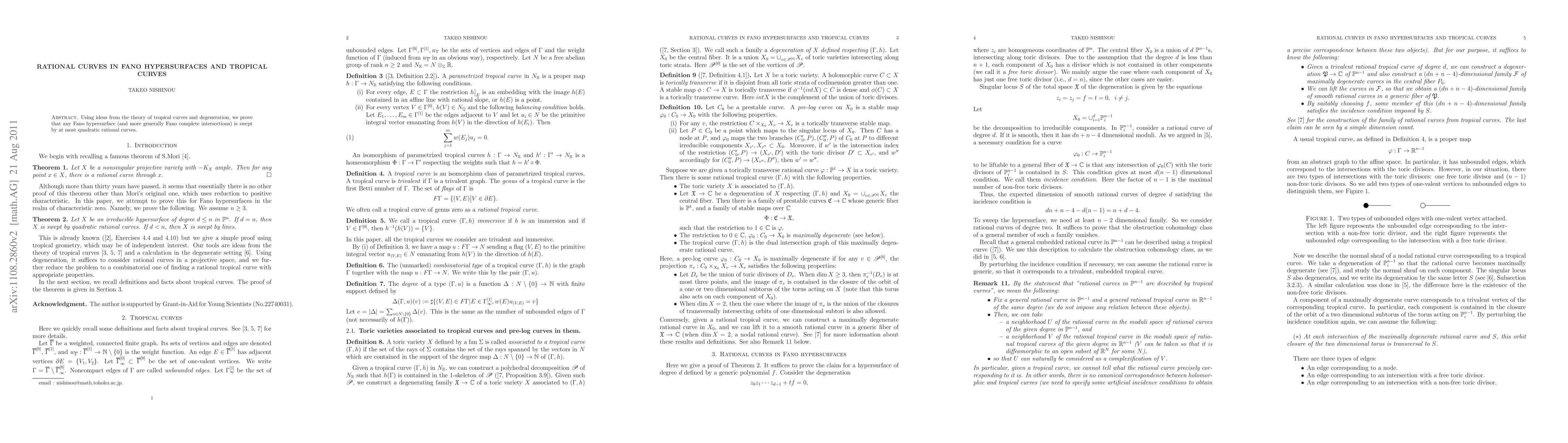 Summary: The paper demonstrates that Fano hypersurfaces, and more broadly Fano complete intersections, can be covered by at most quadratic rational curves through the application of tropical curve theory and degeneration techniques.
