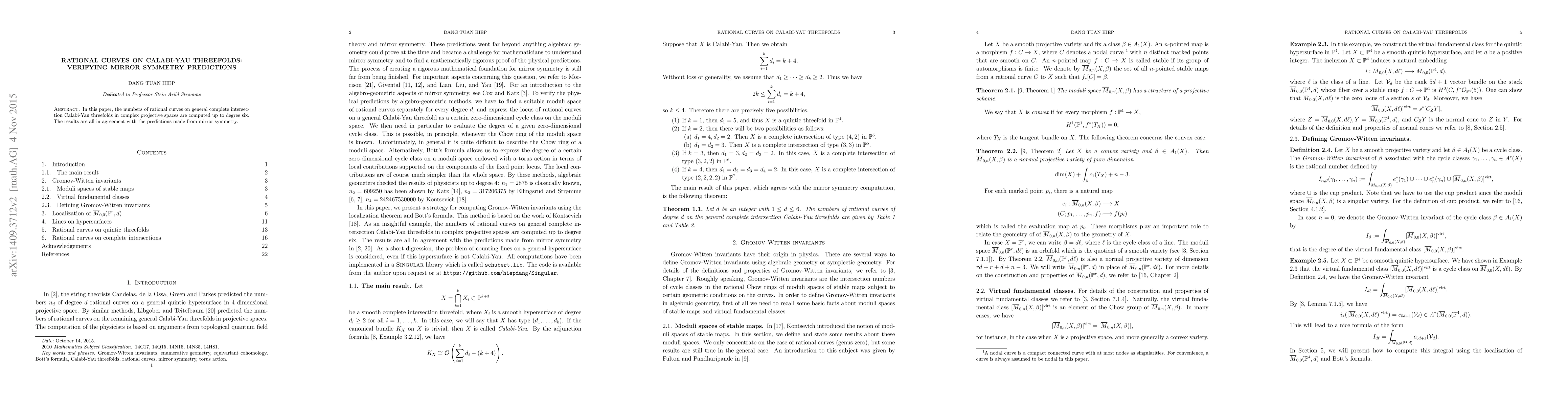 Summary: This study computes the number of rational curves on Calabi-Yau threefolds up to degree six and confirms these results align with predictions derived from mirror symmetry. The findings support the validity of mirror symmetry in this context.