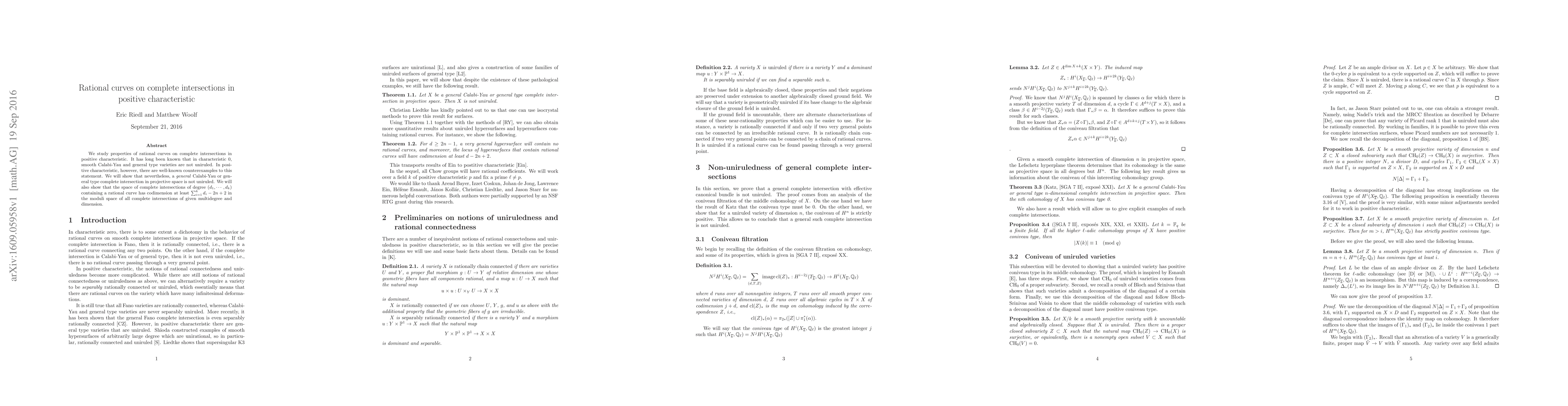 This paper investigates rational curves on complete intersections in positive characteristic, demonstrating that general Calabi-Yau or general type complete intersections in projective space are not uniruled. It also establishes a lower bound for the codimension of the space of complete intersections containing a rational curve.