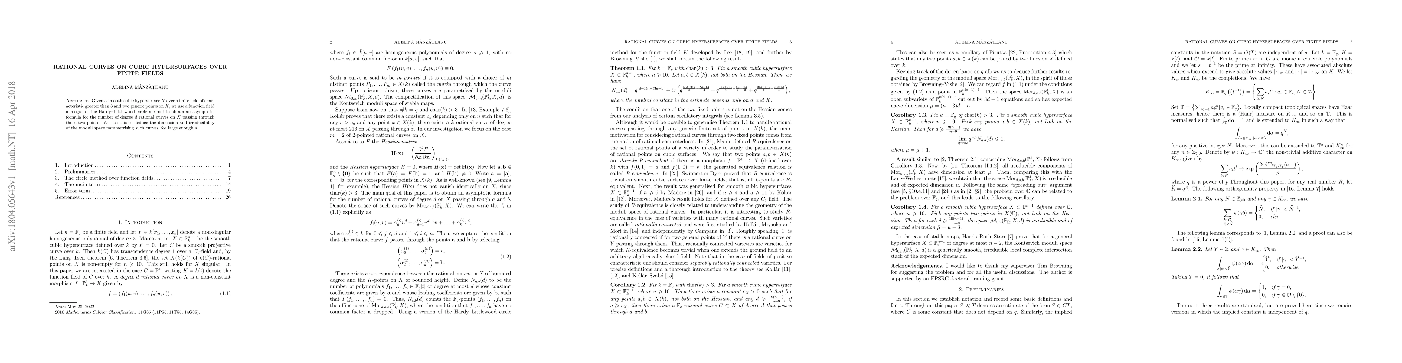 Given a smooth cubic hypersurface $X$ over a finite field of characteristic greater than 3 and two generic points on $X$, we use a function field analogue of the Hardy-Littlewood circle method to obtain an asymptotic formula for the number of degree $d$ rational curves on $X$ passing through those two points. We use this to deduce the dimension and irreducibility of the moduli space parametrising such curves, for large enough $d$.