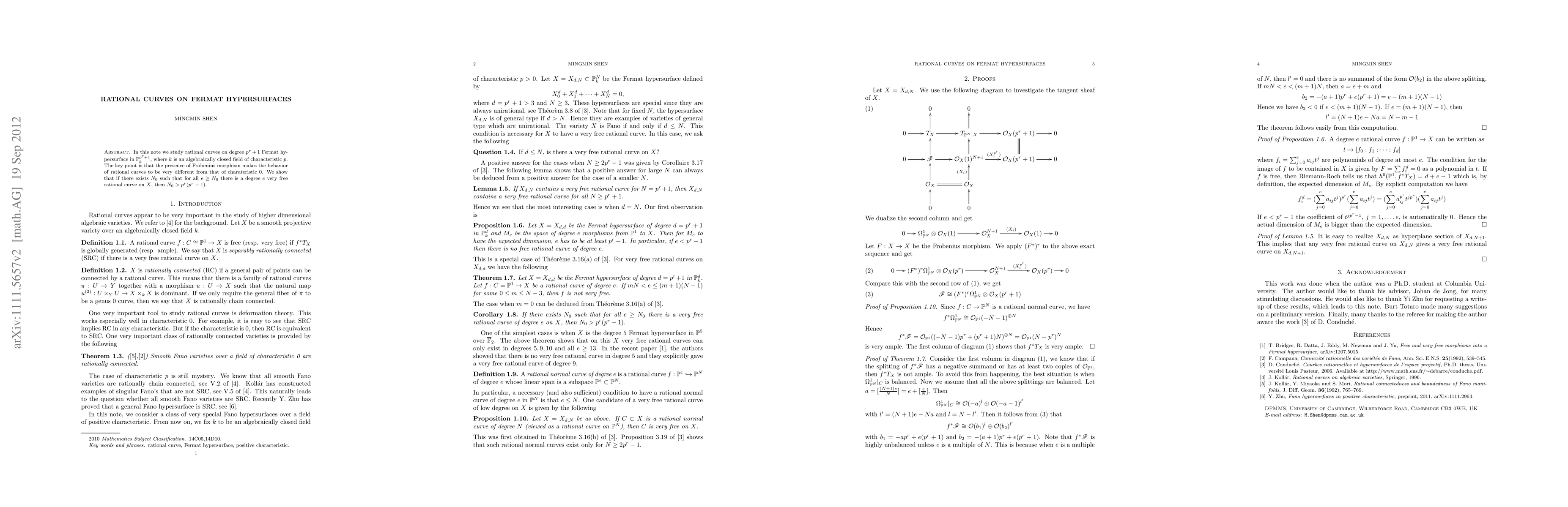 This paper investigates rational curves on Fermat hypersurfaces of degree $p^r+1$ in $\PP^{p^r+1}_k$, highlighting the distinct behavior due to the Frobenius morphism in characteristic $p$. It proves that the existence of very free rational curves of degree $e$ for sufficiently large $e$ implies $N_0 > p^r(p^r-1)$.