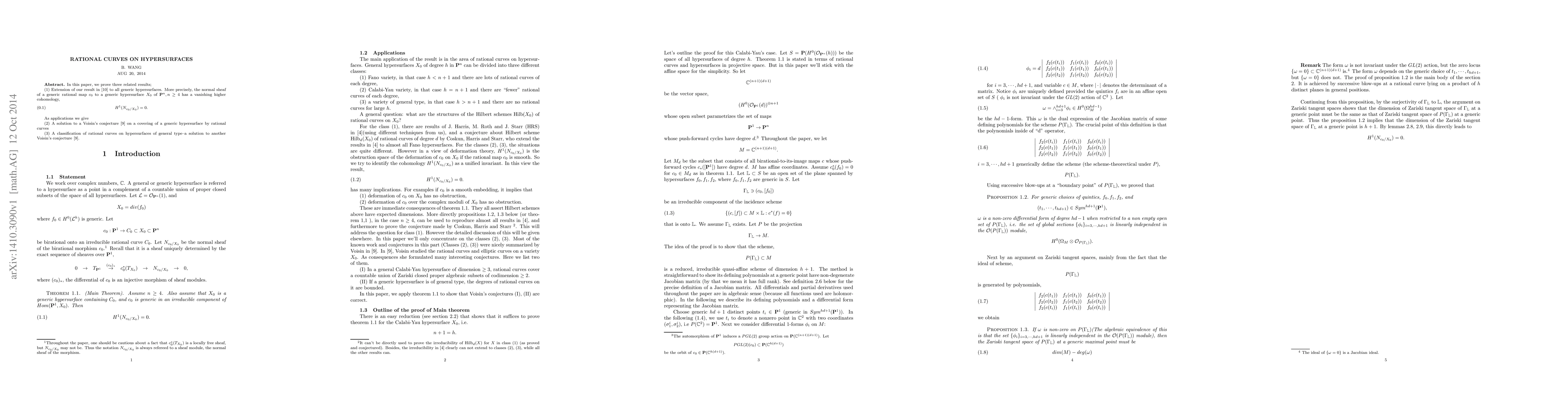 This paper extends a previous result to generic hypersurfaces, proving that the normal sheaf of a generic rational map to such hypersurfaces has vanishing higher cohomology. It also solves two conjectures by Voisin: one on covering hypersurfaces by rational curves and another on classifying rational curves on hypersurfaces of general type.