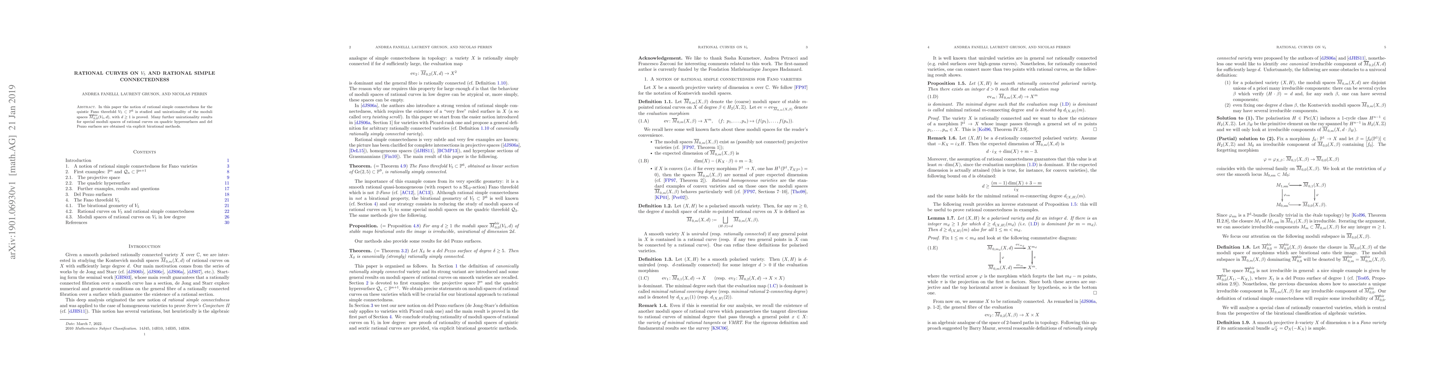 This paper investigates rational simple connectedness of the quintic Fano threefold $V_5$ and proves the unirationality of its moduli spaces for rational curves. It also extends these results to moduli spaces of rational curves on quadric hypersurfaces and del Pezzo surfaces using explicit birational methods.