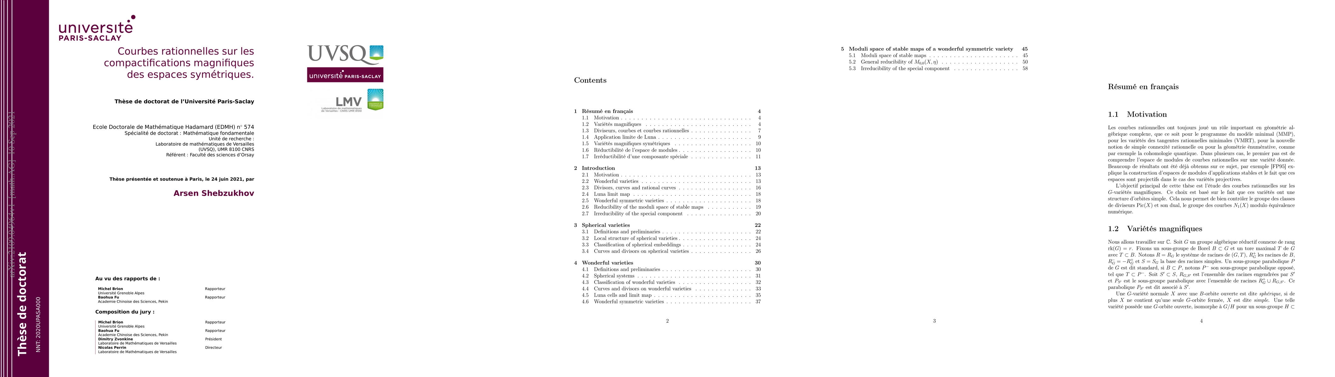 This work is a PhD thesis. First we provide some general context on wonderful varieties and moduli spaces of rational curves. Working over complex numbers we prove that the moduli space of rational curves with no marked points on the wonderful compactification of a symmetric space is not irreducible in general. Lastly we show that in the case of wonderful group compactifications the set of rational curves with no marked points and irreducible source is irreducible.