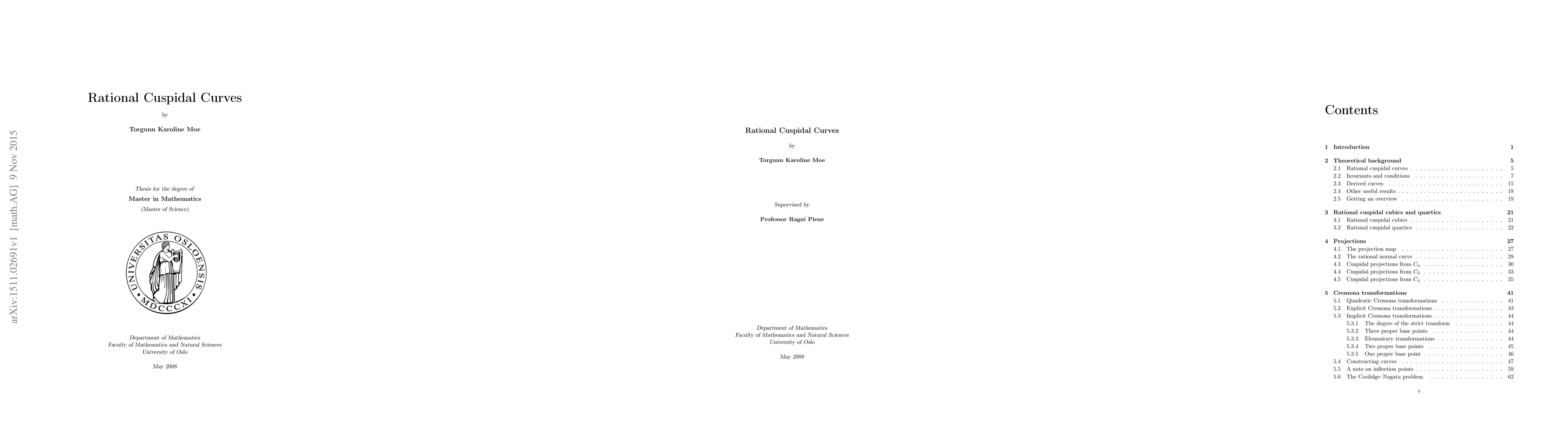 This 2008 Master's thesis from the University of Oslo offers a comprehensive review of plane rational cuspidal curves, with a focus on those of low degree. Although it does not present new research, it serves as a valuable resource on the subject, noting that subsequent publications have introduced new findings on related topics.