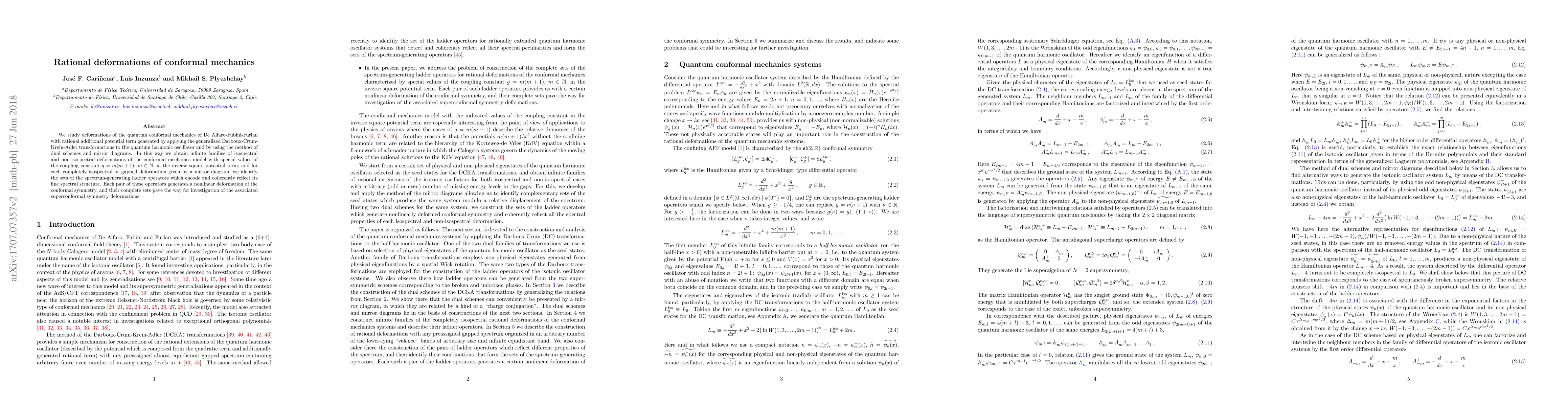 We study deformations of the quantum conformal mechanics of De Alfaro-Fubini-Furlan with rational additional potential term generated by applying the generalized Darboux-Crum-Krein-Adler transformations to the quantum harmonic oscillator and by using the method of dual schemes and mirror diagrams. In this way we obtain infinite families of isospectral and non-isospectral deformations of the conformal mechanics model with special values of the coupling constant $g=m(m+1)$, $m\in {\mathbb N}$, in the inverse square potential term, and for each completely isospectral or gapped deformation given by a mirror diagram, we identify the sets of the spectrum-generating ladder operators which encode and coherently reflect its fine spectral structure. Each pair of these operators generates a nonlinear deformation of the conformal symmetry, and their complete sets pave the way for investigation of the associated superconformal symmetry deformations.