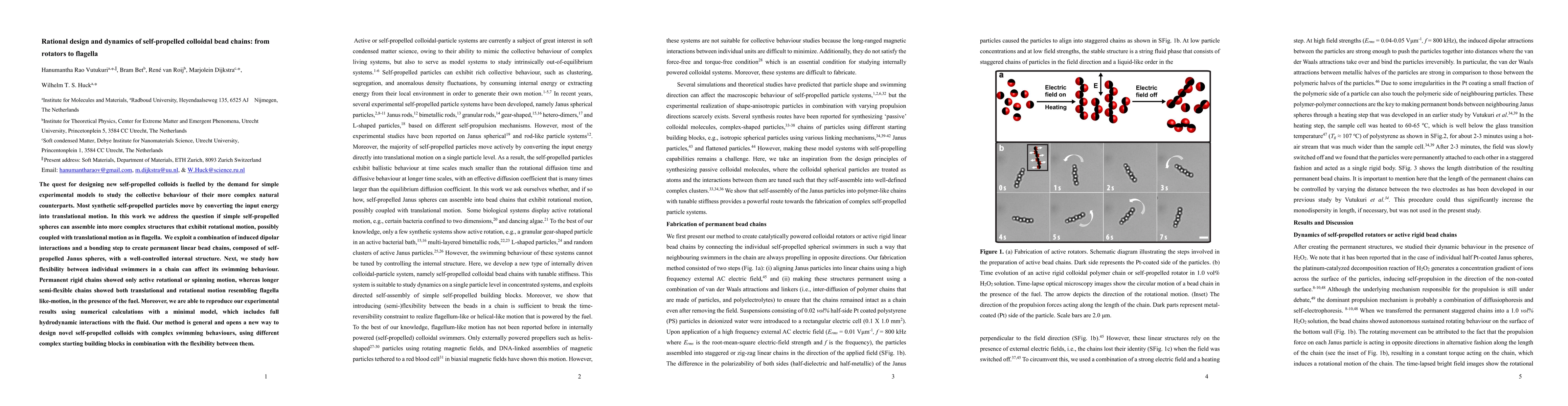 This research explores the creation of self-propelled colloidal bead chains, demonstrating that rigid chains exhibit spinning motion, while flexible chains display both rotational and translational motion akin to flagella. The study combines induced dipolar interactions and bonding to form permanent linear chains of Janus spheres, and validates findings with numerical hydrodynamic models.