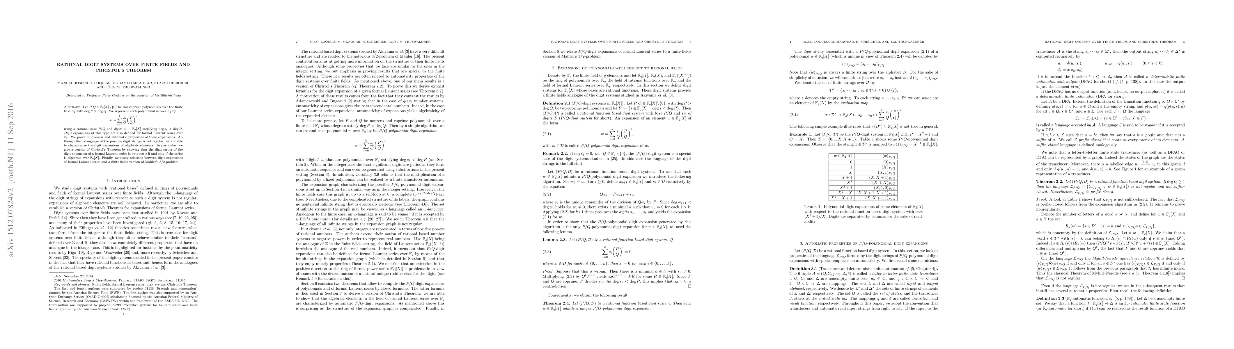 This paper explores rational digit systems over finite fields, proving uniqueness and automatic properties of these expansions. It characterizes the digit expansions of algebraic elements, providing a finite fields version of Christol's Theorem and linking it to Mahler's 3/2 problem.
