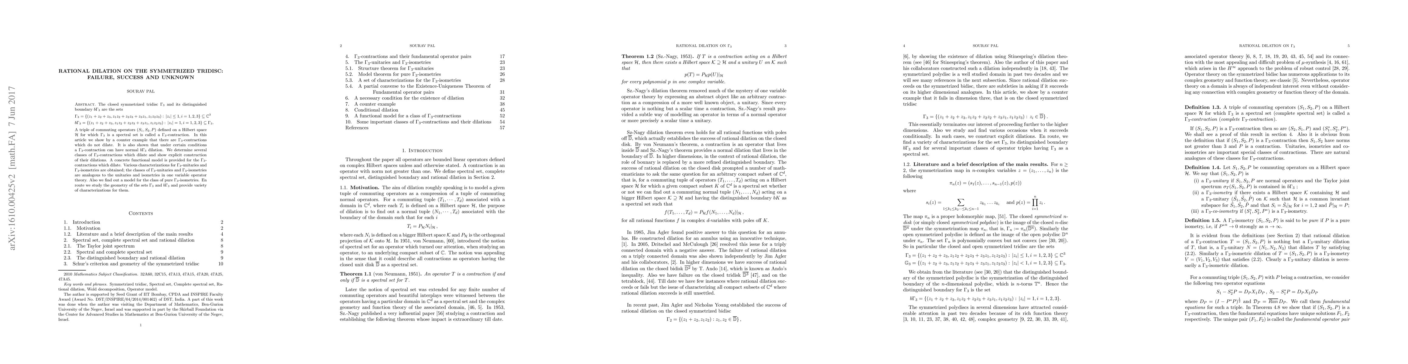 The closed symmetrized tridisc $\Gamma_3$ and its distinguished boundary $b\Gamma_3$ are the sets $\Gamma_3=\{ (z_1+z_2+z_3,z_1z_2+z_2z_3+z_3z_1,z_1z_2z_3): \,|z_i|\leq 1, i=1,2,3 \}\subseteq \mathbb C^3$ $b\Gamma_3=\{ (z_1+z_2+z_3,z_1z_2+z_2z_3+z_3z_1,z_1z_2z_3): \,|z_i|= 1, i=1,2,3 \}\subseteq \Gamma_3.$ A triple of commuting operators $(S_1,S_2,P)$ defined on a Hilbert space $\mathcal H$ for which $\Gamma_3$ is a spectral set is called a $\Gamma_3$-contraction. In this article we show by a counter example that there are $\Gamma_3$-contractions which do not dilate. It is also shown that under certain conditions a $\Gamma_3$-contraction can have normal $b\Gamma_3$ dilation. We determine several classes of $\Gamma_3$-contractions which dilate and show explicit construction of their dilations. A concrete functional model is provided for the $\Gamma_3$-contractions which dilate. Various characterizations for $\Gamma_3$-unitaries and $\Gamma_3$-isometries are obtained; the classes of $\Gamma_3$-unitaries and $\Gamma_3$-isometries are analogous to the unitaries and isometries in one variable operator theory. Also we find out a model for the class of pure $\Gamma_3$-isometries. En route we study the geometry of the sets $\Gamma_3$ and $b\Gamma_3$ and provide variety of characterizations for them.