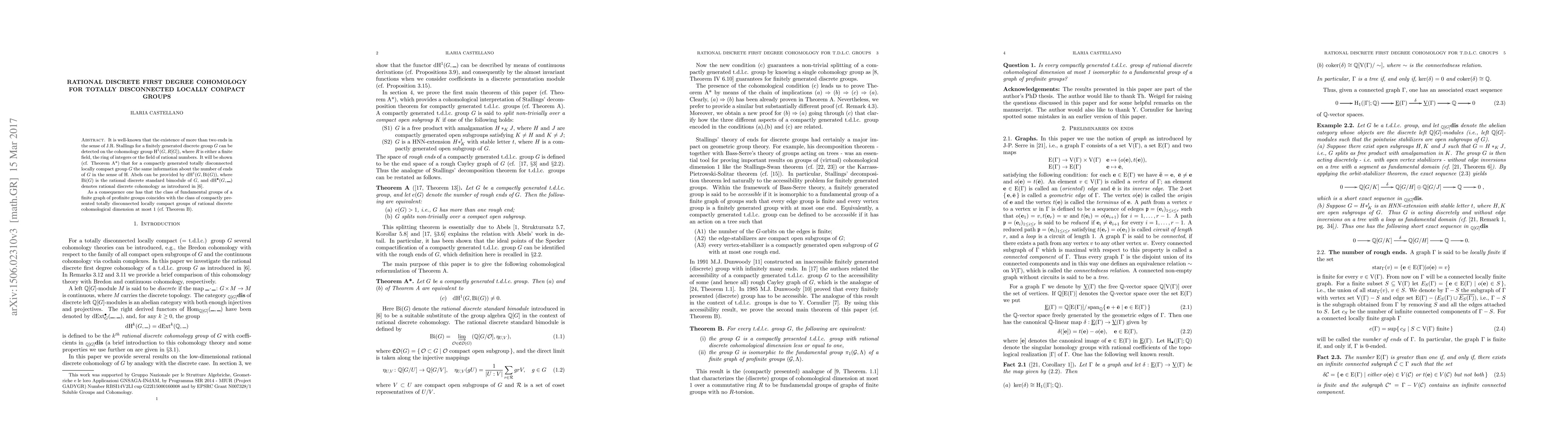 This paper demonstrates that the number of ends in a compactly generated totally disconnected locally compact group can be detected through its rational discrete first degree cohomology with respect to the rational discrete standard bimodule. It also shows that fundamental groups of finite graphs of profinite groups align with compactly presented totally disconnected locally compact groups of rational discrete cohomological dimension at most 1.