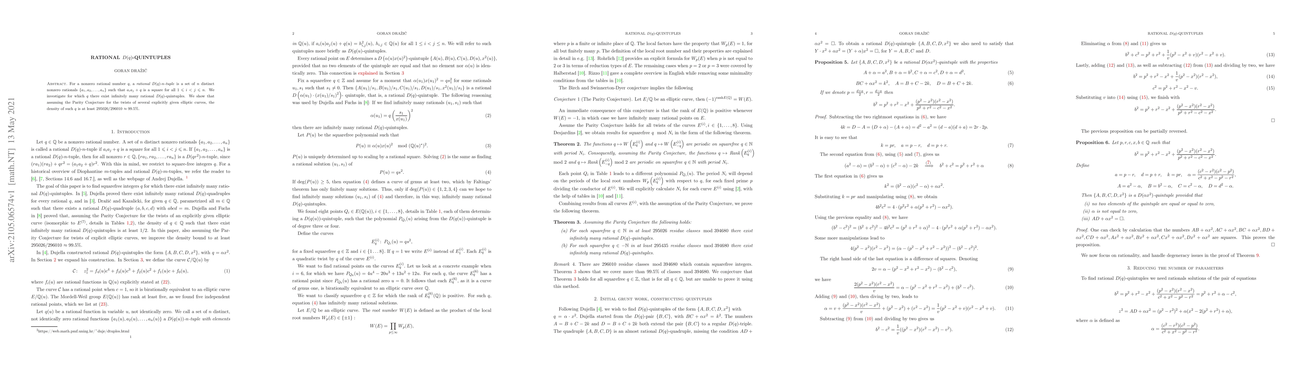 This paper studies rational $D(q)$-quintuples, sets of five distinct rationals where the sum of any two elements multiplied together plus $q$ is a square. The authors prove that under the Parity Conjecture for certain elliptic curves, the density of such $q$ values is approximately 99.5%.