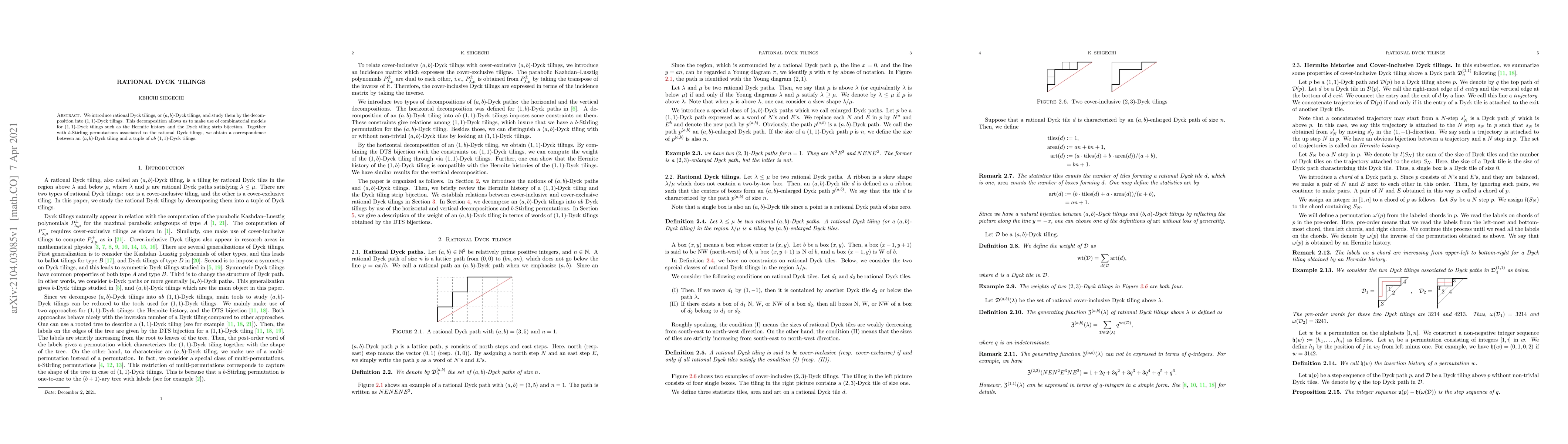 This paper introduces rational Dyck tilings, or $(a,b)$-Dyck tilings, and explores their decomposition into $(1,1)$-Dyck tilings, leveraging combinatorial models like the Hermite history and the Dyck tiling strip bijection. It establishes a correspondence between $(a,b)$-Dyck tilings and tuples of $ab$ $(1,1)$-Dyck tilings using $b$-Stirling permutations.