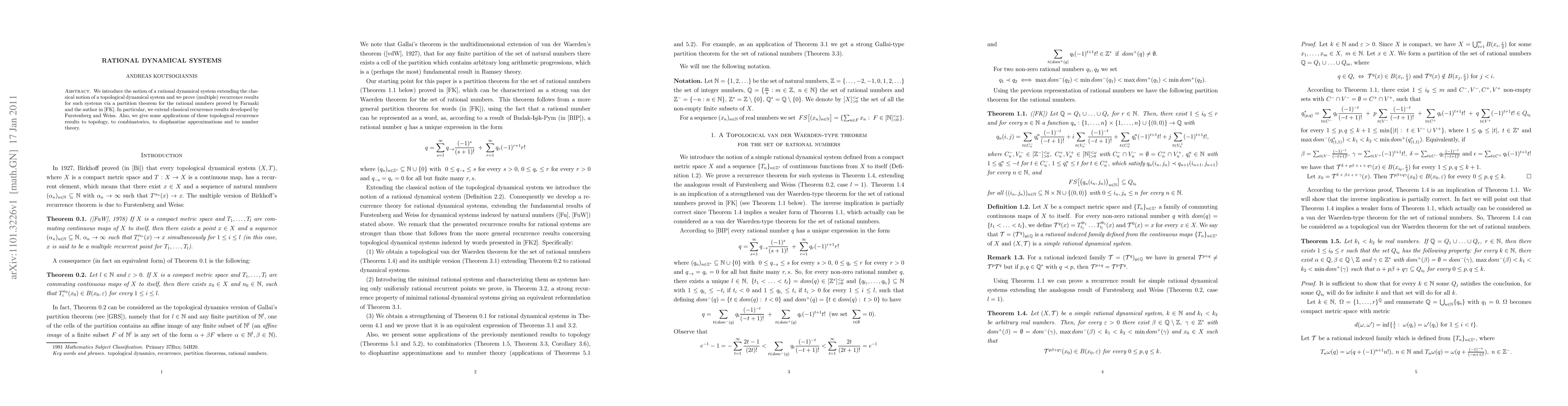 We introduce the notion of a rational dynamical system extending the classical notion of a topological dynamical system and we prove (multiple) recurrence results for such systems via a partition theorem for the rational numbers proved by Farmaki and the author. In particular, we extend classical recurrence results developed by Furstenberg and Weiss. Also, we give some applications of these topological recurrence results to topology, to combinatorics, to diophantine approximations and to number theory.