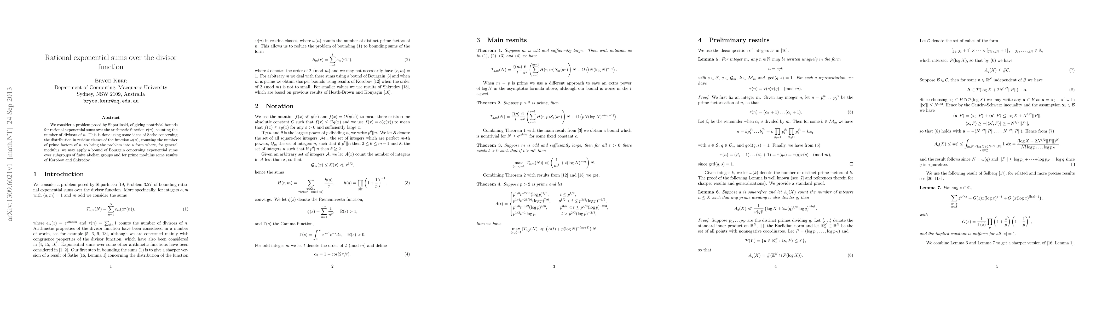 We consider a problem posed by Shparlinski, of giving nontrivial bounds for rational exponential sums over the arithmetic function $\tau(n)$, counting the number of divisors of $n$. This is done using some ideas of Sathe concerning the distribution in residue classes of the function $\omega(n)$, counting the number of prime factors of $n$, to bring the problem into a form where, for general modulus, we may apply a bound of Bourgain concerning exponential sums over subgroups of finite abelian groups and for prime modulus some results of Korobov and Shkredov.