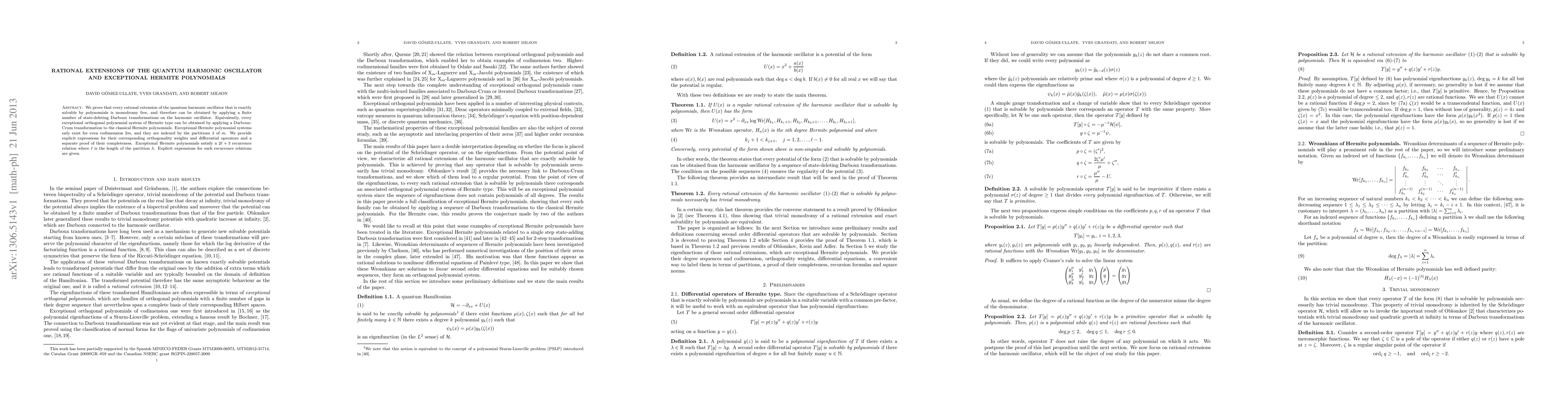 This paper demonstrates that rational extensions of the quantum harmonic oscillator solvable by polynomials are monodromy free and obtainable via state-deleting Darboux transformations. It also shows that exceptional Hermite polynomials, existing only for even codimension 2m and indexed by partitions of m, arise from Darboux-Crum transformations of classical Hermite polynomials, with explicit expressions for their orthogonality weights and recurrence relations.