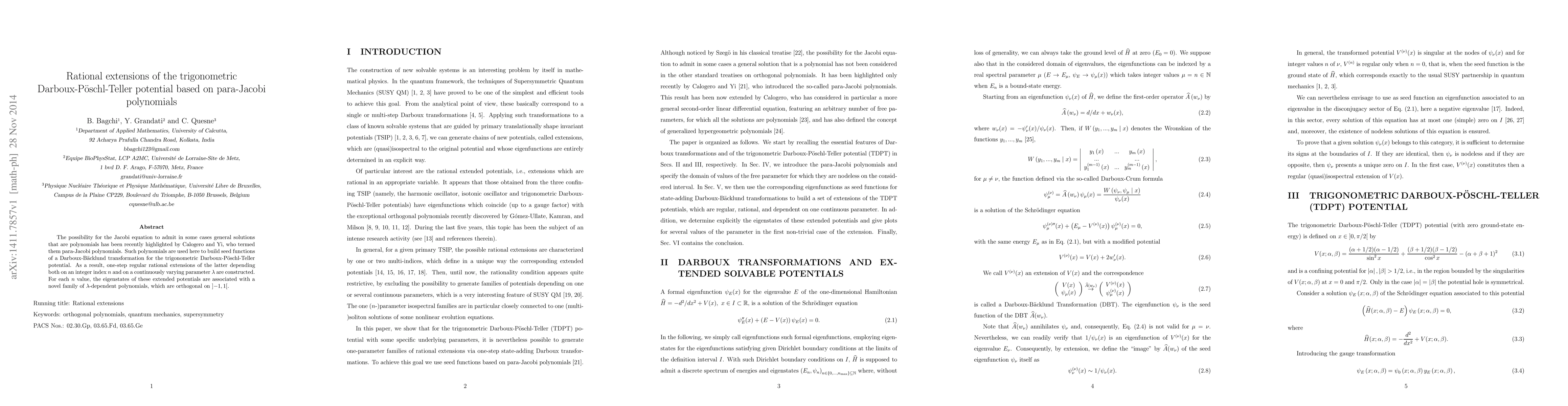 The possibility for the Jacobi equation to admit in some cases general solutions that are polynomials has been recently highlighted by Calogero and Yi, who termed them para-Jacobi polynomials. Such polynomials are used here to build seed functions of a Darboux-B\"acklund transformation for the trigonometric Darboux-P\"oschl-Teller potential. As a result, one-step regular rational extensions of the latter depending both on an integer index $n$ and on a continuously varying parameter $\lambda$ are constructed. For each $n$ value, the eigenstates of these extended potentials are associated with a novel family of $\lambda$-dependent polynomials, which are orthogonal on $\left] -1,1\right[ $.