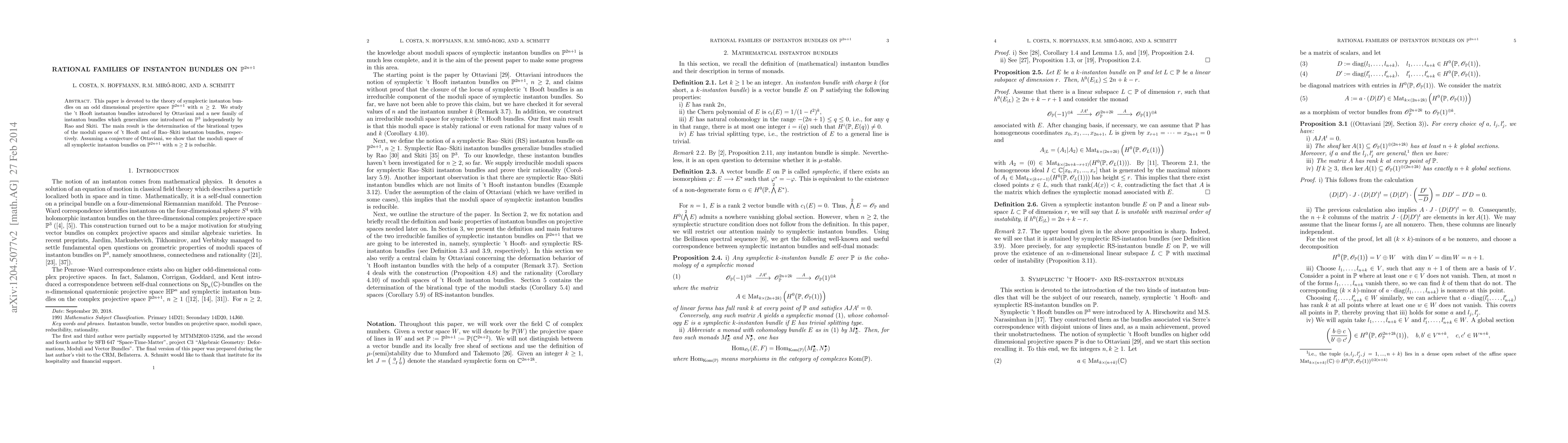 This paper is devoted to the theory of symplectic instanton bundles on an odd dimensional projective space ${\mathbb P}^{2n+1}$ with $n\ge 2$. We study the 't Hooft instanton bundles introduced by Ottaviani and a new family of instanton bundles which generalizes one introduced on ${\mathbb P}^3$ independently by Rao and Skiti. The main result is the determination of the birational types of the moduli spaces of 't Hooft and of Rao-Skiti instanton bundles, respectively. Assuming a conjecture of Ottaviani, we show that the moduli space of all symplectic instanton bundles on ${\mathbb P}^{2n+1}$ with $n\ge 2$ is reducible.