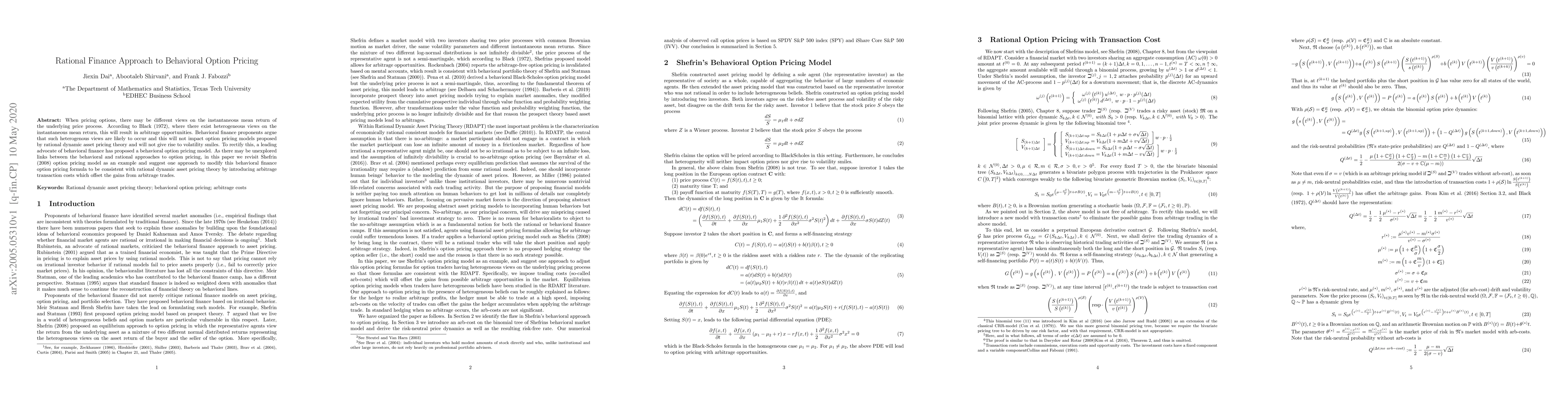 When pricing options, there may be different views on the instantaneous mean return of the underlying price process. According to Black (1972), where there exist heterogeneous views on the instantaneous mean return, this will result in arbitrage opportunities. Behavioral finance proponents argue that such heterogenous views are likely to occur and this will not impact option pricing models proposed by rational dynamic asset pricing theory and will not give rise to volatility smiles. To rectify this, a leading advocate of behavioral finance has proposed a behavioral option pricing model. As there may be unexplored links between the behavioral and rational approaches to option pricing, in this paper we revisit Shefrin (2008) option pricing model as an example and suggest one approach to modify this behavioral finance option pricing formula to be consistent with rational dynamic asset pricing theory by introducing arbitrage transaction costs which offset the gains from arbitrage trades.