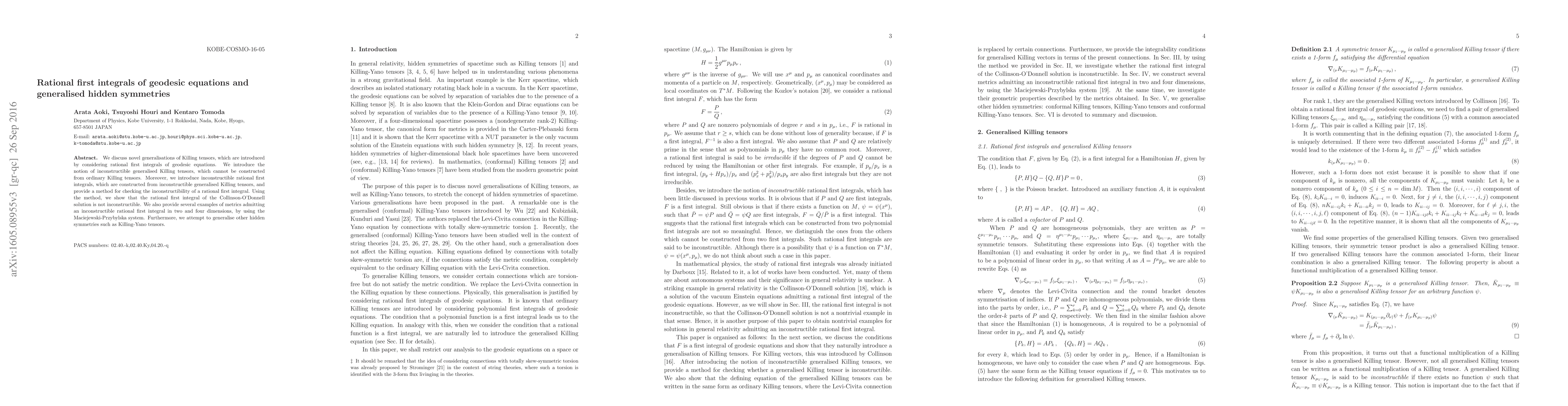 We discuss novel generalisations of Killing tensors, which are introduced by considering rational first integrals of geodesic equations. We introduce the notion of inconstructible generalised Killing tensors, which cannot be constructed from ordinary Killing tensors. Moreover, we introduce inconstructible rational first integrals, which are constructed from inconstructible generalised Killing tensors, and provide a method for checking the inconstructibility of a rational first integral. Using the method, we show that the rational first integral of the Collinson-O'Donnell solution is not inconstructible. We also provide several examples of metrics admitting an inconstructible rational first integral in two and four dimensions, by using the Maciejewski-Przybylska system. Furthermore, we attempt to generalise other hidden symmetries such as Killing-Yano tensors.