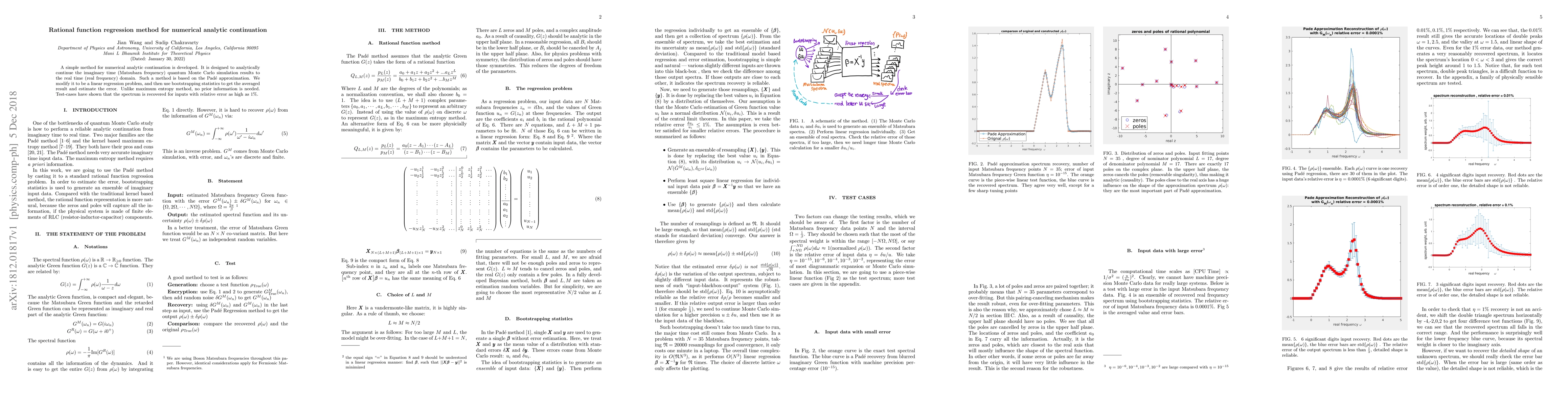 Summary: This paper introduces a rational function regression method for numerical analytic continuation, transforming the Padé approximation into a linear regression problem to extend quantum Monte Carlo simulation results from imaginary to real time domains. The method does not require prior information and demonstrates effective spectrum recovery even with high input errors.