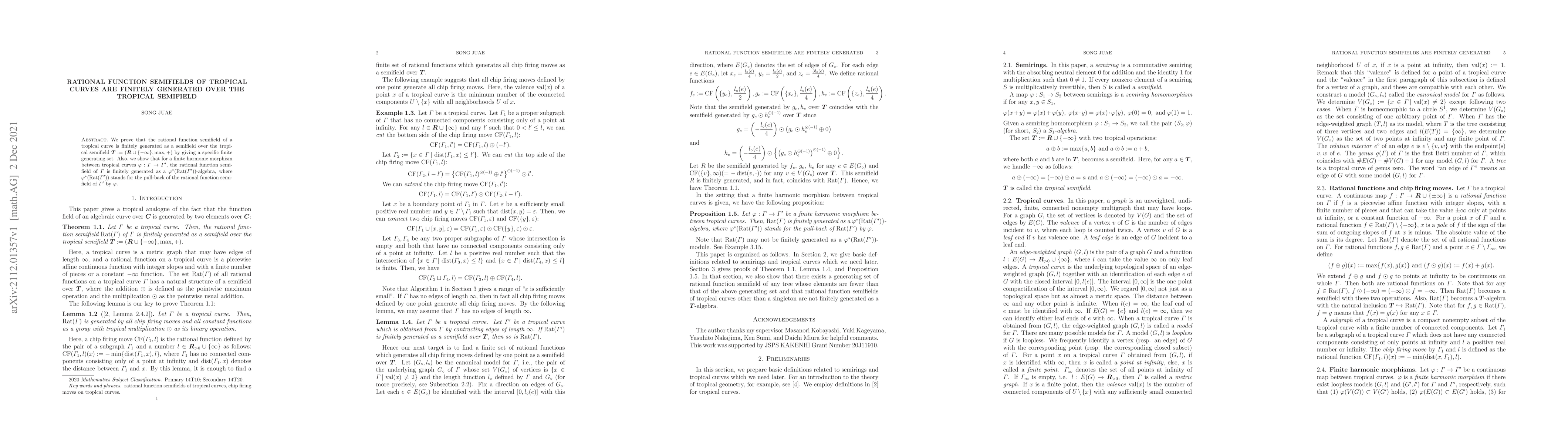 This paper proves that the rational function semifield of a tropical curve is finitely generated over the tropical semifield $\boldsymbol{T}$. It also demonstrates that for a finite harmonic morphism between tropical curves, the rational function semifield of the source curve is finitely generated as an algebra over the pull-back of the target curve's rational function semifield.