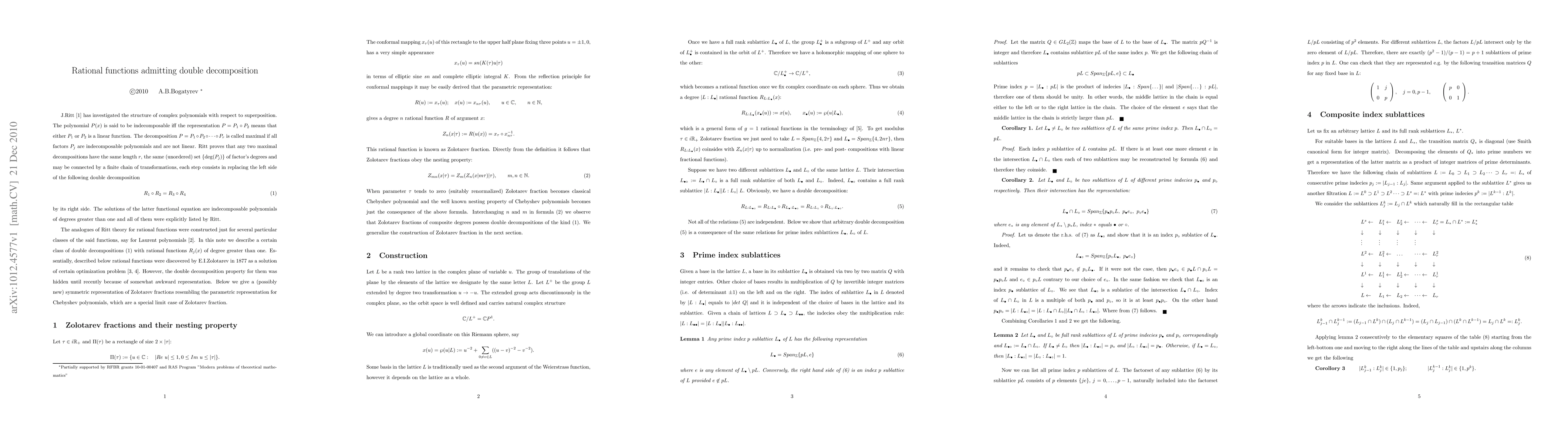 J.Ritt has investigated the structure of complex polynomials with respect to superposition. In particular, he listed all the polynomials admitting different double decompositions into indecomposable polynomials. The analogues of Ritt theory for rational functions were constructed just for several particular classes of the said functions, say for Laurent polynomials (F.Pakovich). In this note we describe a certain class of double decompositions for rational functions. Essentially, described below rational functions were discovered by E.I.Zolotarev in 1877 as a solution of certain optimization problem. However, the double decomposition property for them was hidden until recently because of somewhat awkward representation. We give a (possibly new) symmetric representation of Zolotarev fractions resembling the parametric representation for Chebyshev polynomials, which are a special limit case of Zolotarev fraction.