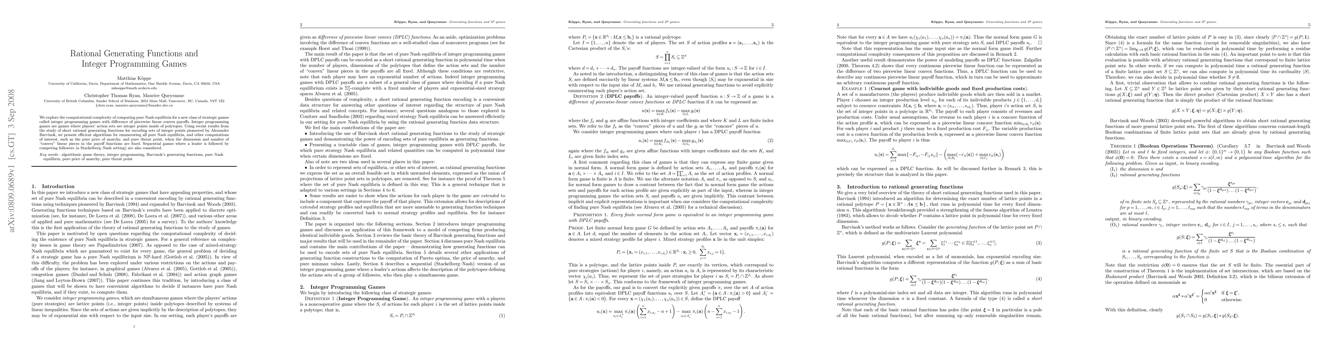 We explore the computational complexity of computing pure Nash equilibria for a new class of strategic games called integer programming games with difference of piecewise linear convex payoffs. Integer programming games are games where players' action sets are integer points inside of polytopes. Using recent results from the study of short rational generating functions for encoding sets of integer points pioneered by Alexander Barvinok, we present efficient algorithms for enumerating all pure Nash equilibria, and other computations of interest, such as the pure price of anarchy, and pure threat point, when the dimension and number of "convex" linear pieces in the payoff functions are fixed. Sequential games where a leader is followed by competing followers (a Stackelberg--Nash setting) are also considered.