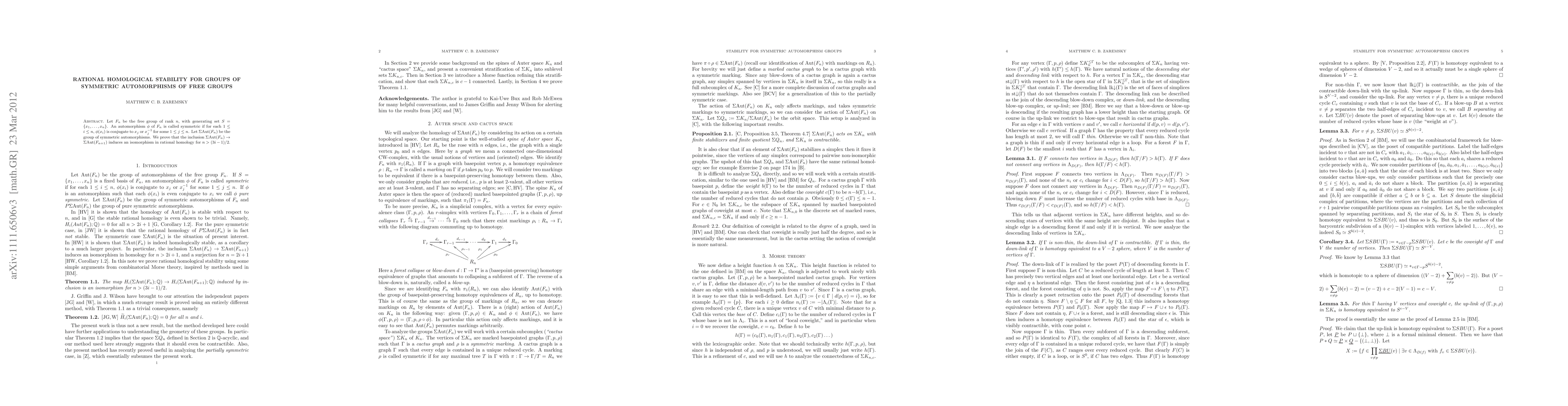 Let F_n be the free group of rank n, with generating set S=\{x_1,...,x_n\}. An automorphism \phi of F_n is called symmetric if for each 1\leq i\leq n, \phi(x_i) is conjugate to x_j or x_j^{-1} for some 1\leq j\leq n. Let \Sigma Aut(F_n) be the group of symmetric automorphisms. We prove that the inclusion \Sigma Aut(F_n) \rightarrow \Sigma Aut(F_{n+1}) induces an isomorphism in rational homology for n>(3i-1)/2.