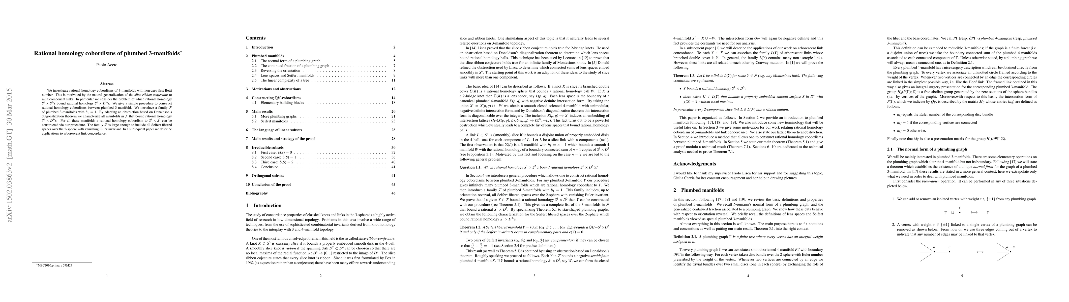 We investigate rational homology cobordisms of 3-manifolds with non-zero first Betti number. This is motivated by the natural generalization of the slice-ribbon conjecture to multicomponent links. In particular we consider the problem of which rational homology $S^1\times S^2$'s bound rational homology $S^1\times D^3$'s. We give a simple procedure to construct rational homology cobordisms between plumbed 3-manifold. We introduce a family F of plumbed 3-manifolds with first Betti number equal to 1. By adapting an obstruction based on Donaldson's diagonalization theorem we characterize all manifolds in F that bound rational homology $S^1\times D^3$'s. For all these manifolds a rational homology cobordism to $S^1\times S^2$ can be constructed via our procedure. The family F is large enough to include all Seifert fibered spaces over the 2-sphere with vanishing Euler invariant. In a subsequent paper we describe applications to arborescent link concordance.