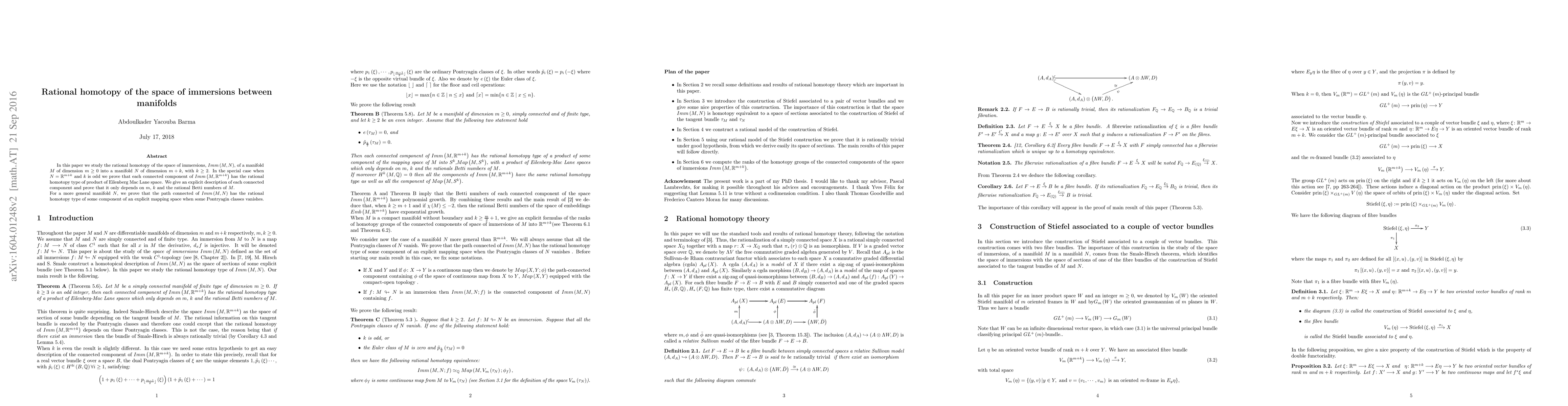 In this paper we study the rational homotopy of the space of immersions, $Imm\left(M,N\right)$, of a manifold $M$ of dimension $m\geq 0$ into a manifold $N$ of dimension $m+k$, with $k\geq 2$. In the special case when $N=\mathbb{R}^{m+k}$ and $k$ is odd we prove that each connected component of $Imm\left(M,\mathbb{R}^{m+k}\right)$ has the rational homotopy type of product of Eilenberg Mac Lane space. We give an explicit description of each connected component and prove that it only depends on $m$, $k$ and the rational Betti numbers of $M$. For a more general manifold $N$, we prove that the path connected of $Imm\left(M,N\right)$ has the rational homotopy type of some component of an explicit mapping space when some Pontryagin classes vanishes.