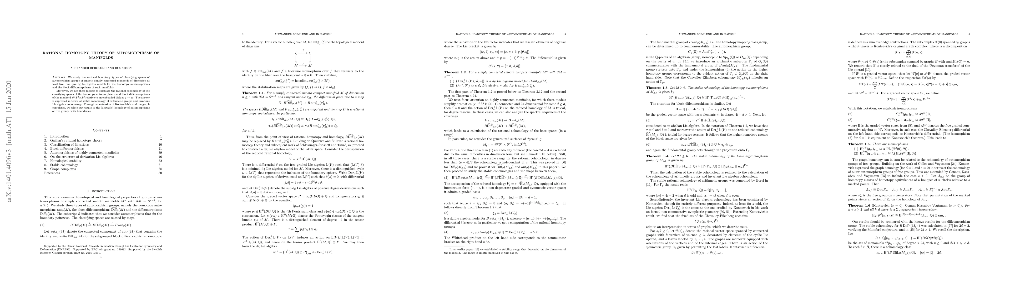 This paper investigates the rational homotopy types of automorphism groups of high-dimensional, simply connected manifolds, providing dg Lie algebra models for their homotopy automorphisms and block diffeomorphisms. It calculates the rational cohomology of classifying spaces for these automorphisms and relates these findings to stable cohomology of arithmetic groups and the homology of automorphisms of free groups with boundaries.