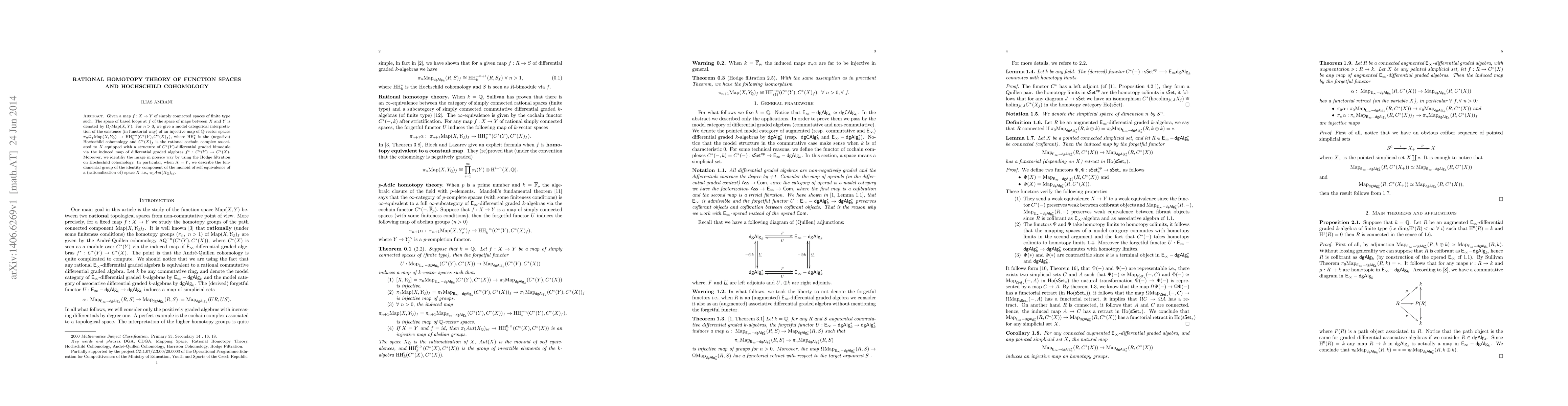Given a map $f: X\rightarrow Y$ of simply connected spaces of finite type such. The space of based loops at $f$ of the space of maps between $X$ and $Y$ is denoted by $\Omega_{f} Map(X,Y)$. For $n> 0$, we give a model categorical interpretation of the existence (in functorial way) of an injective map of $\mathbb{Q}$-vector spaces $\pi_{n} \Omega_{f}Map(X,Y_{\mathbb{Q}}) \rightarrow HH^{-n}(C^{\ast}(Y),C^{\ast}(X)_{f})$, where $HH^{\ast}$ is the (negative) Hochschild cohomology and $C^{\ast}(X)_{f}$ is the rational cochain complex associated to $X$ equipped with a structure of $C^{\ast}(Y)$-differential graded bimodule via the induced map of differential graded algebras $f^{\ast}: C^{\ast}(Y)\rightarrow C^{\ast}(X)$. Moreover, we identifiy the image in presice way by using the Hodge filtration on Hochschild cohomology. In particular, when $X=Y$, we describe the fundamental group of the identity component of the monoid of self equivalence of a (rationalization of) space $X$ i.e., $\pi_{1} Aut(X_{\mathbb{Q}})_{id}$.