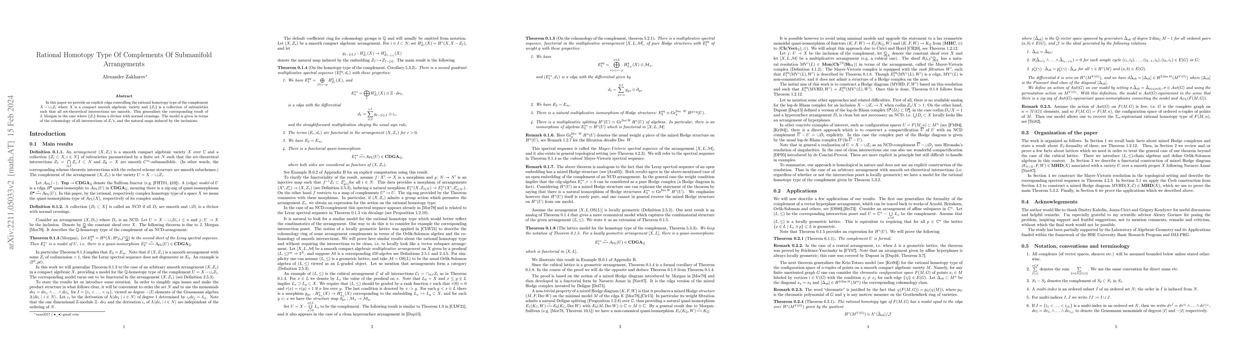 We will provide an explicit cdga controlling the rational homotopy type of the complement to a smooth arrangement $X-\cup_i Z_i$ in a smooth compact algebraic variety $X$ over $\mathbb{C}$. This generalizes the corresponding result of Morgan in case of a divisor with normal crossings to arbitrary smooth arrangements. The model is given in terms of the arrangement $Z_i$ and agrees with a model introduced by Chen-L\"u-Wu for computing the cohomology. As an application we reprove a formality theorem due to Feichtner-Yuzvinksy. Then we show that the Kritz-Totaro model computes the rational homotopy type in case of chromatic configuration spaces of smooth compact algebraic varieties.