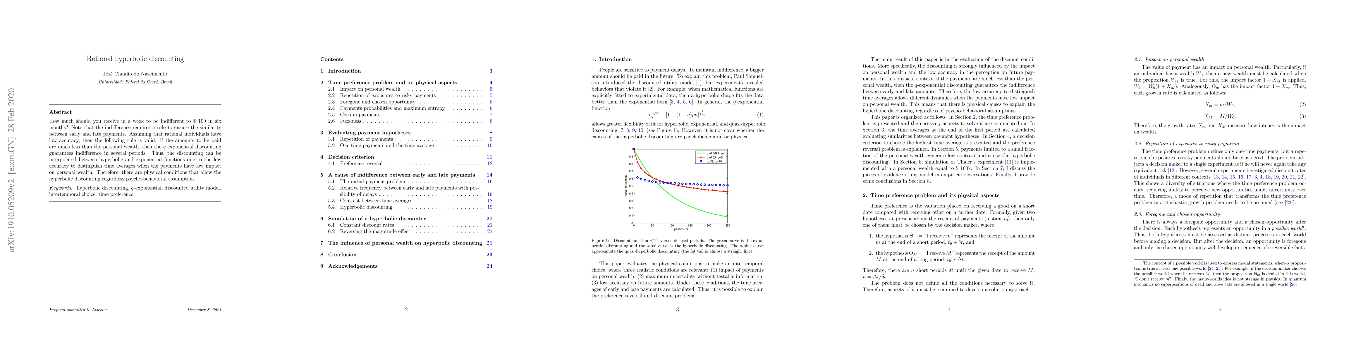 How much should you receive in a week to be indifferent to \$ 100 in six months? Note that the indifference requires a rule to ensure the similarity between early and late payments. Assuming that rational individuals have low accuracy, then the following rule is valid: if the amounts to be paid are much less than the personal wealth, then the $q$-exponential discounting guarantees indifference in several periods. Thus, the discounting can be interpolated between hyperbolic and exponential functions due to the low accuracy to distinguish time averages when the payments have low impact on personal wealth. Therefore, there are physical conditions that allow the hyperbolic discounting regardless psycho-behavioral assumption.