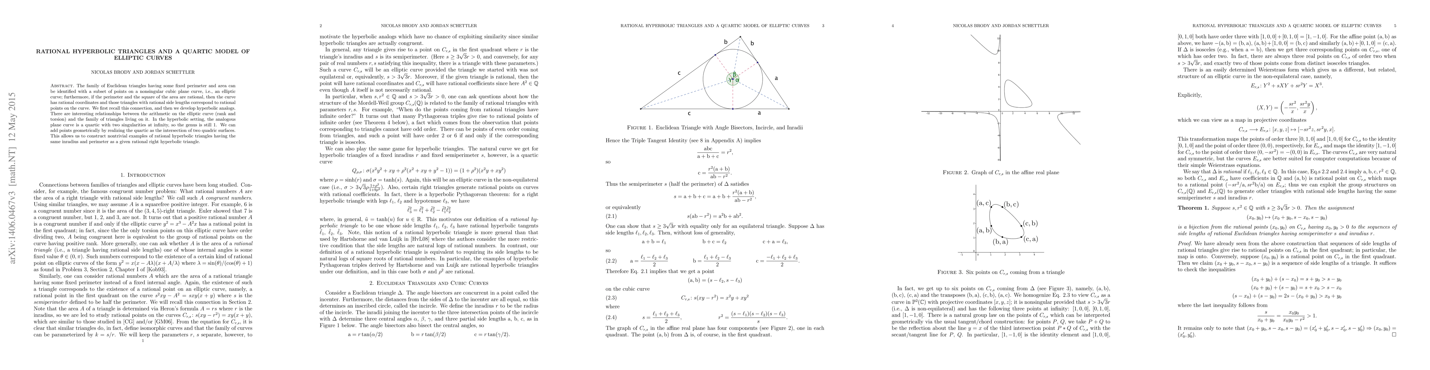 This paper explores the connection between rational hyperbolic triangles and a quartic model of elliptic curves, showing that triangles with rational side lengths correspond to rational points on an elliptic curve. It extends this to hyperbolic geometry, where a quartic curve with two singularities at infinity represents the analogous family of triangles, allowing for the construction of rational hyperbolic triangles with shared inradius and perimeter.