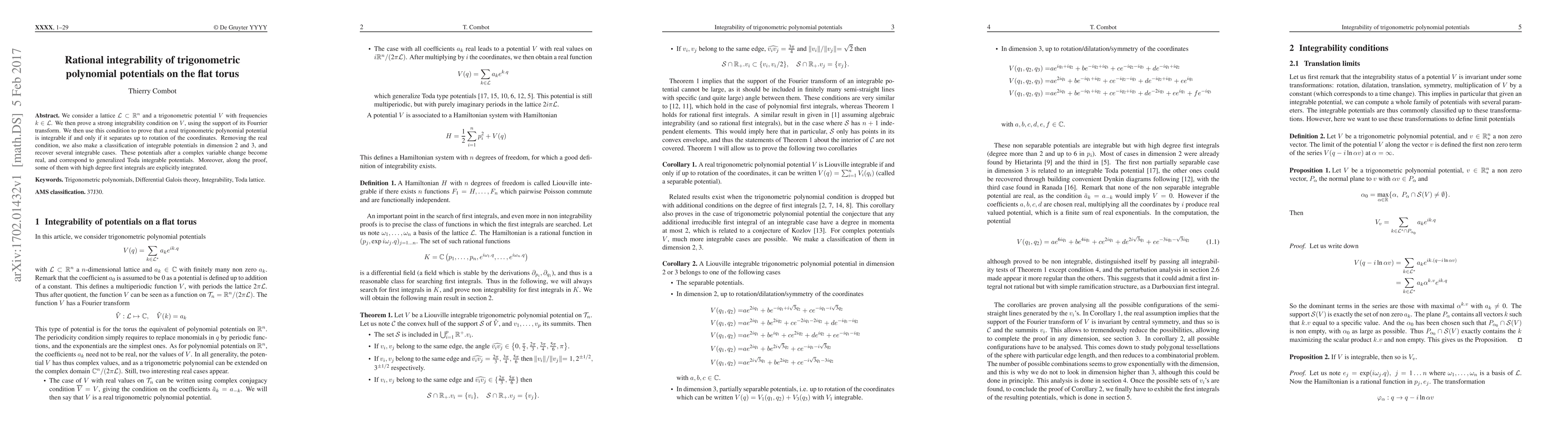 This paper proves strong integrability conditions for trigonometric polynomial potentials on a flat torus using Fourier transform support. It demonstrates that a real trigonometric polynomial potential is integrable if it can be rotated to separate coordinates, classifying integrable potentials in dimensions 2 and 3, and relating them to generalized Toda integrable systems.