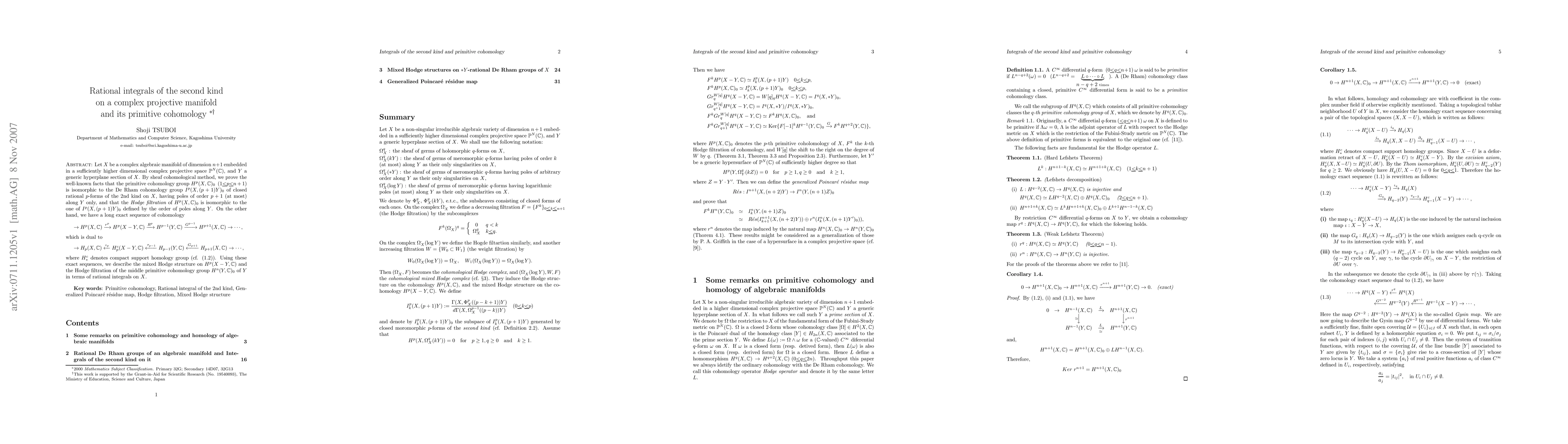 Let X be a complex algebraic manifold of dimension n+1 embedded in a sufficiently higher dimensional complex projective space, and Y a generic hyperplane section of X. We describe the mixed Hodge structure on H^p(X-Y,C) and the Hodge filtration of the middle primitive cohomology group H^n(Y,C)_0 of Y in terms of rational integrals on X. (Key words: Primitive cohomology, Rational integral of the 2nd kind, Generalized Poincare residue map, Hodge filtration, Mixed Hodge structure)