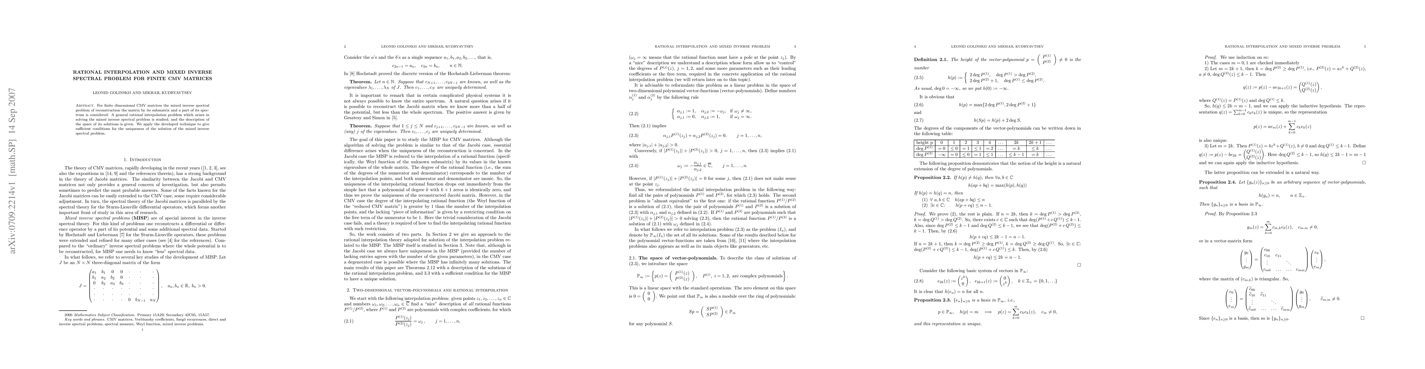 For finite dimensional CMV matrices the mixed inverse spectral problem of reconstruction the matrix by its submatrix and a part of its spectrum is considered. A general rational interpolation problem which arises in solving the mixed inverse spectral problem is studied, and the description of the space of its solutions is given. We apply the developed technique to give sufficient conditions for the uniqueness of the solution of the mixed inverse spectral problem.