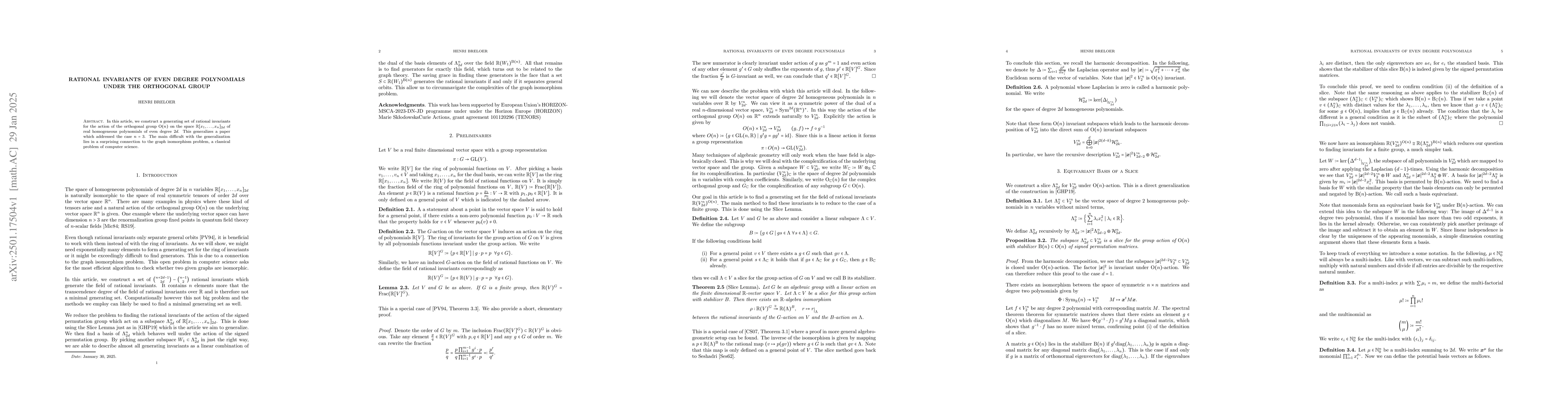 The paper presents a generating set of rational invariants for the orthogonal group action on even-degree polynomials, extending known results from n=3 to general n.