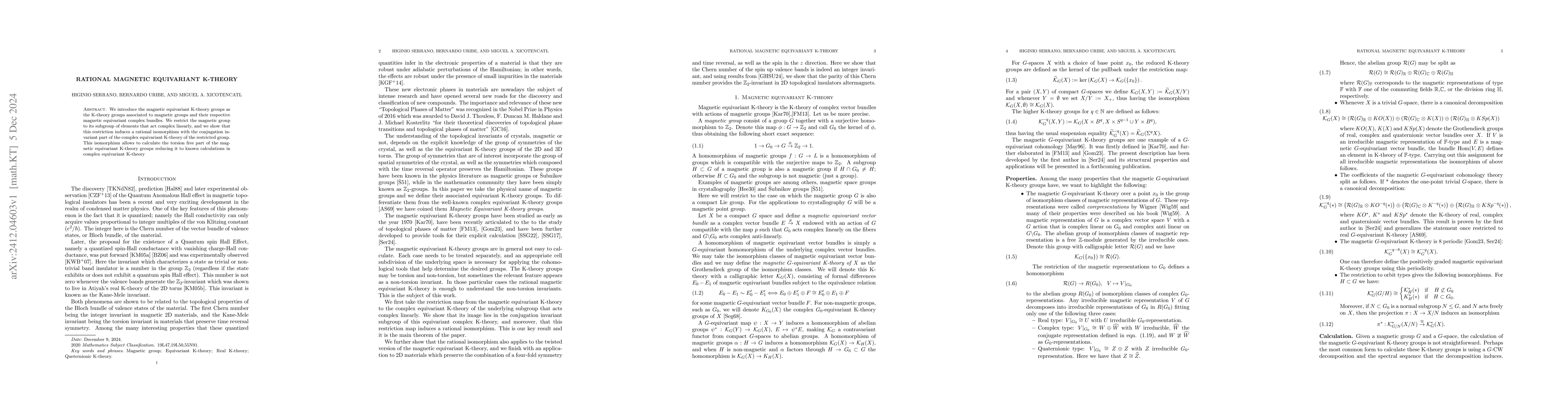 This paper defines magnetic equivariant K-theory groups linked to magnetic groups and magnetic complex bundles. It demonstrates a rational isomorphism between these groups and the conjugation invariant part of the complex equivariant K-theory, simplifying the computation of their torsion-free components.
