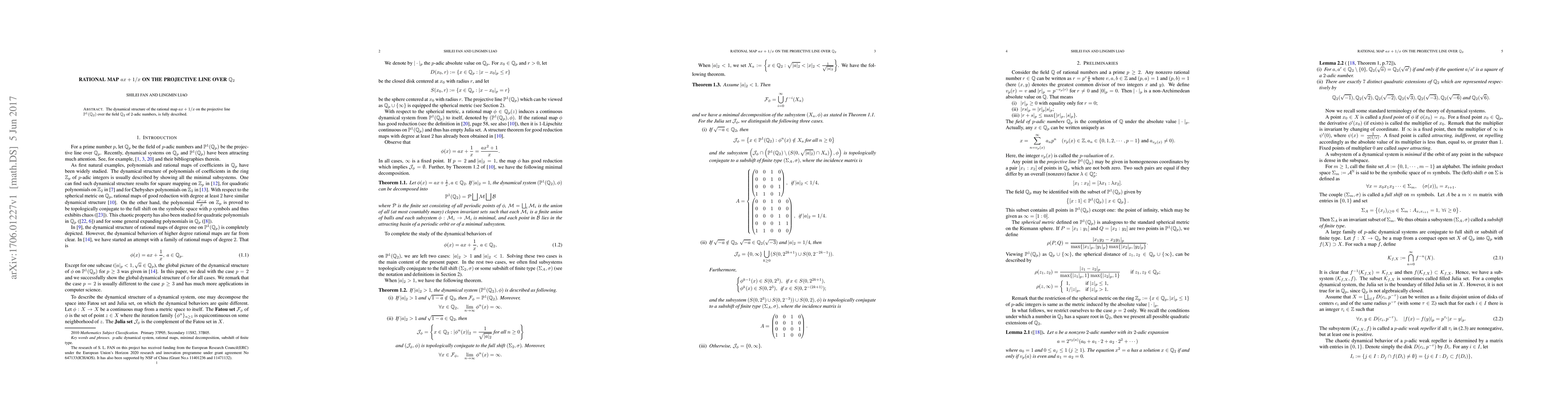 The dynamical structure of the rational map $ax+1/x$ on the projective line over the field Q2 of $2$-adic numbers, is fully described.