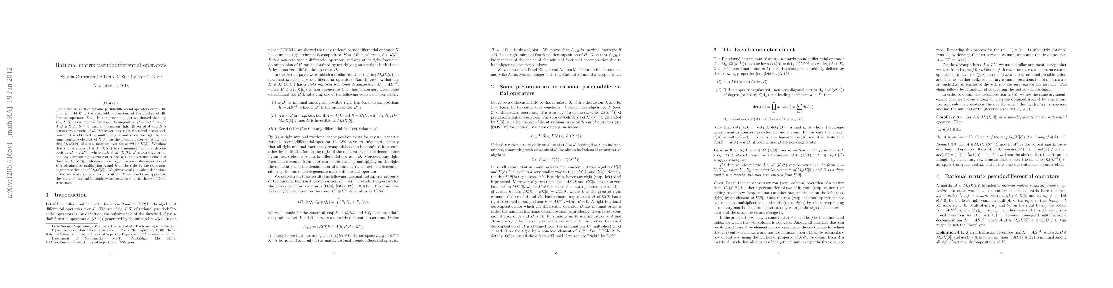 The skewfield K(d) of rational pseudodifferential operators over a differential field K is the skewfield of fractions of the algebra of differential operators K[d]. In our previous paper we showed that any H from K(d) has a minimal fractional decomposition H=AB^(-1), where A,B are elements of K[d], B is non-zero, and any common right divisor of A and B is a non-zero element of K. Moreover, any right fractional decomposition of H is obtained by multiplying A and B on the right by the same non-zero element of K[d]. In the present paper we study the ring M_n(K(d)) of nxn matrices over the skewfield K(d). We show that similarly, any H from M_n(K(d)) has a minimal fractional decomposition H=AB^(-1), where A,B are elements of M_n(K[d]), B is non-degenerate, and any common right divisor of A and B is an invertible element of the ring M_n(K[d]). Moreover, any right fractional decomposition of H is obtained by multiplying A and B on the right by the same non-degenerate element of M_n(K [d]). We give several equivalent definitions of the minimal fractional decomposition. These results are applied to the study of maximal isotropicity property, used in the theory of Dirac structures.