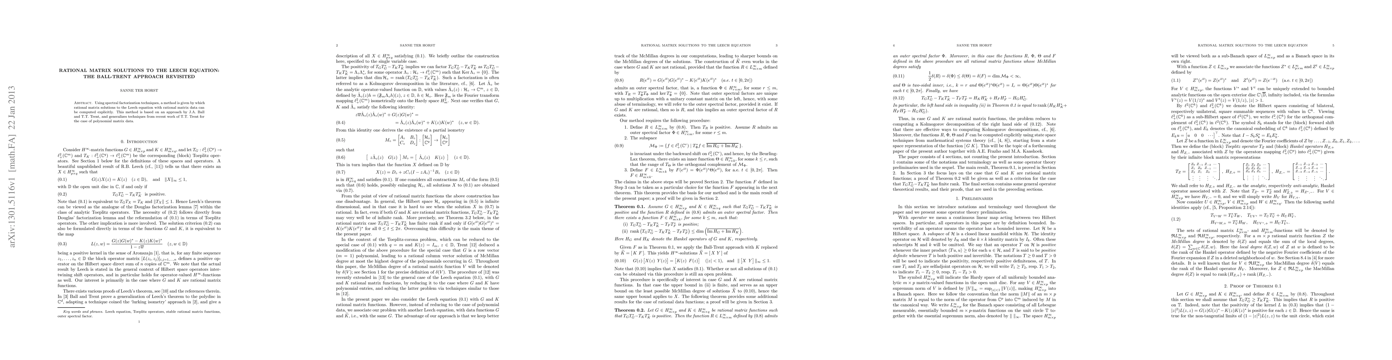 Summary: This paper presents a method using spectral factorization to compute rational matrix solutions to the Leech equation with rational data, based on the Ball-Trent approach and extending Trent's recent work for polynomial matrix data.