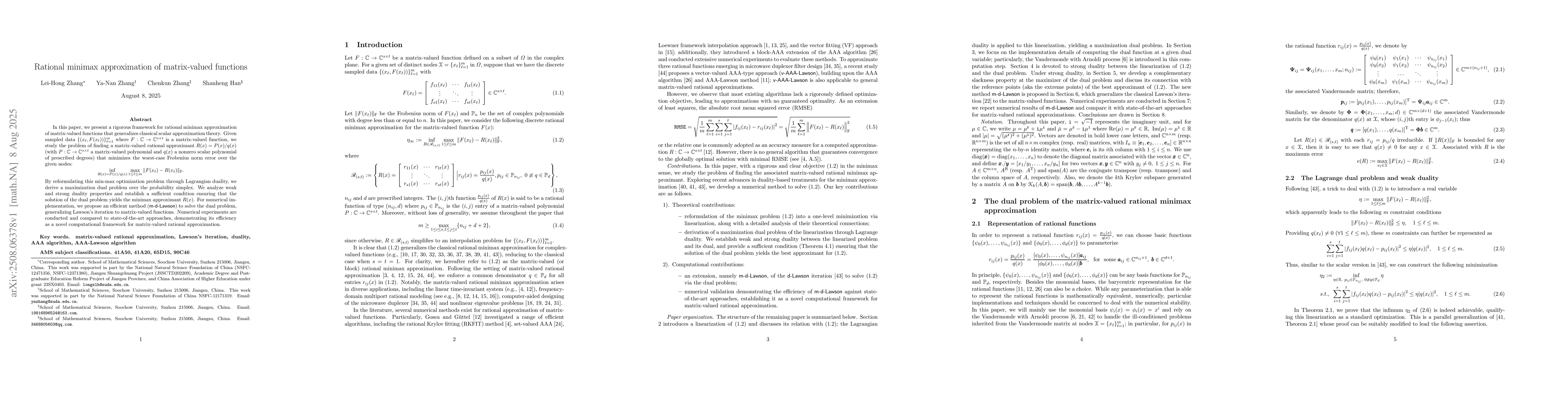 The paper introduces a dual problem formulation for matrix-valued rational minimax approximation, along with an efficient m-d-Lawson method for its numerical solution, generalizing Lawson's iteration to matrix-valued functions.