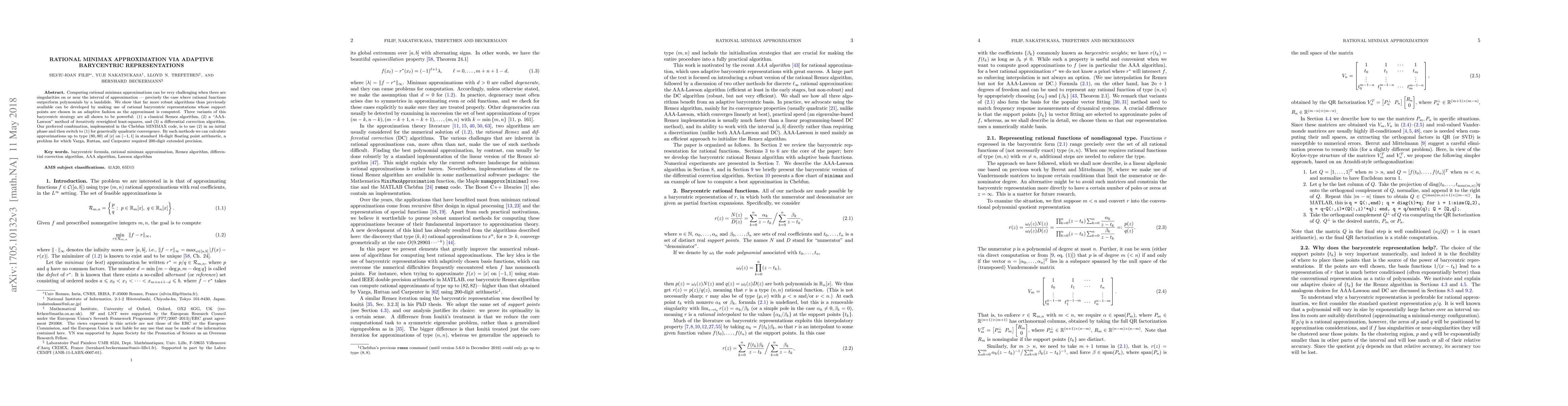 This paper presents adaptive barycentric representations for rational minimax approximation, demonstrating robust algorithms that outperform traditional methods, especially near singularities. The authors propose three barycentric strategies, showing that their preferred combination achieves quadratic convergence and can compute high-degree approximations with standard precision.