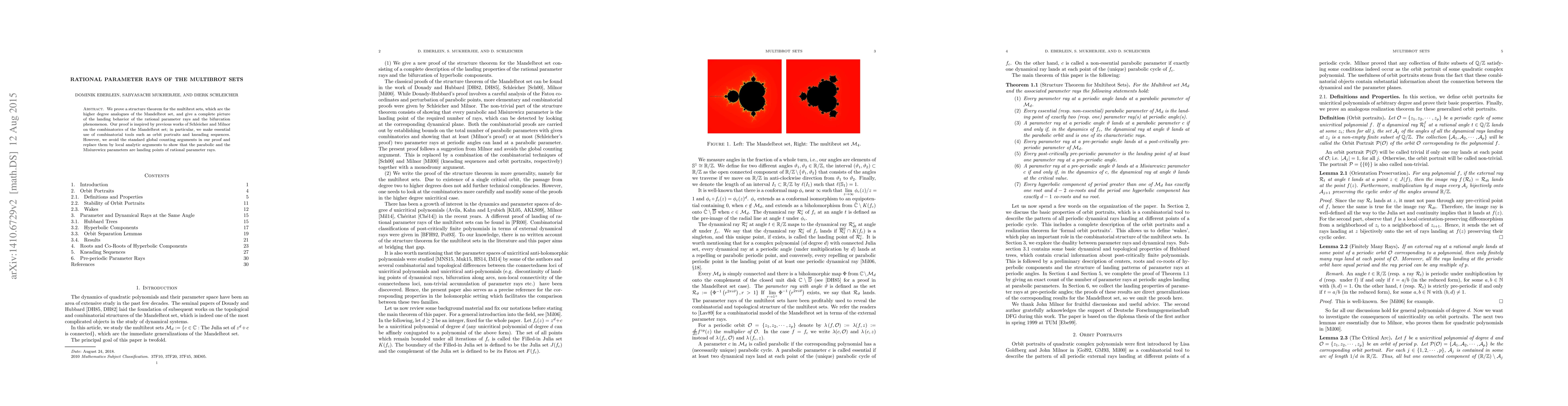 This paper proves a structure theorem for multibrot sets, demonstrating the landing behavior of rational parameter rays and the bifurcation phenomenon using combinatorial tools, and employs local analytic arguments instead of global counting methods to identify parabolic and Misiurewicz parameters as landing points.